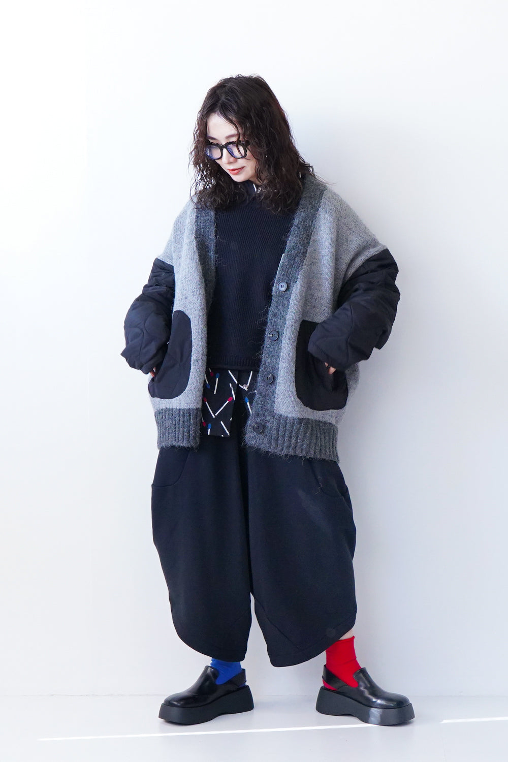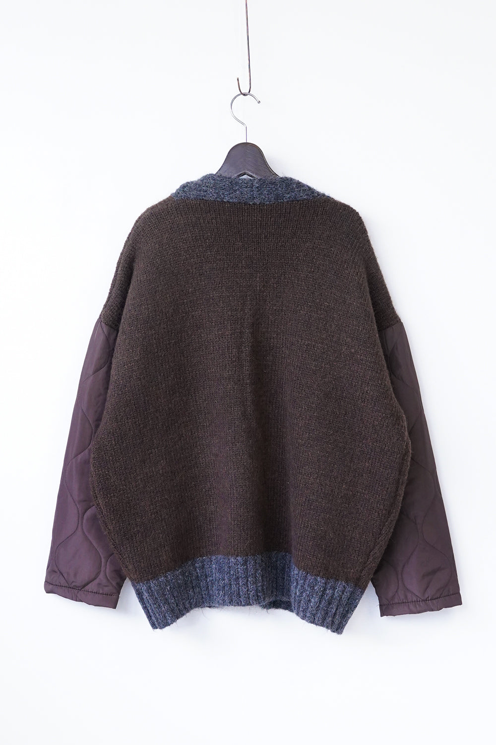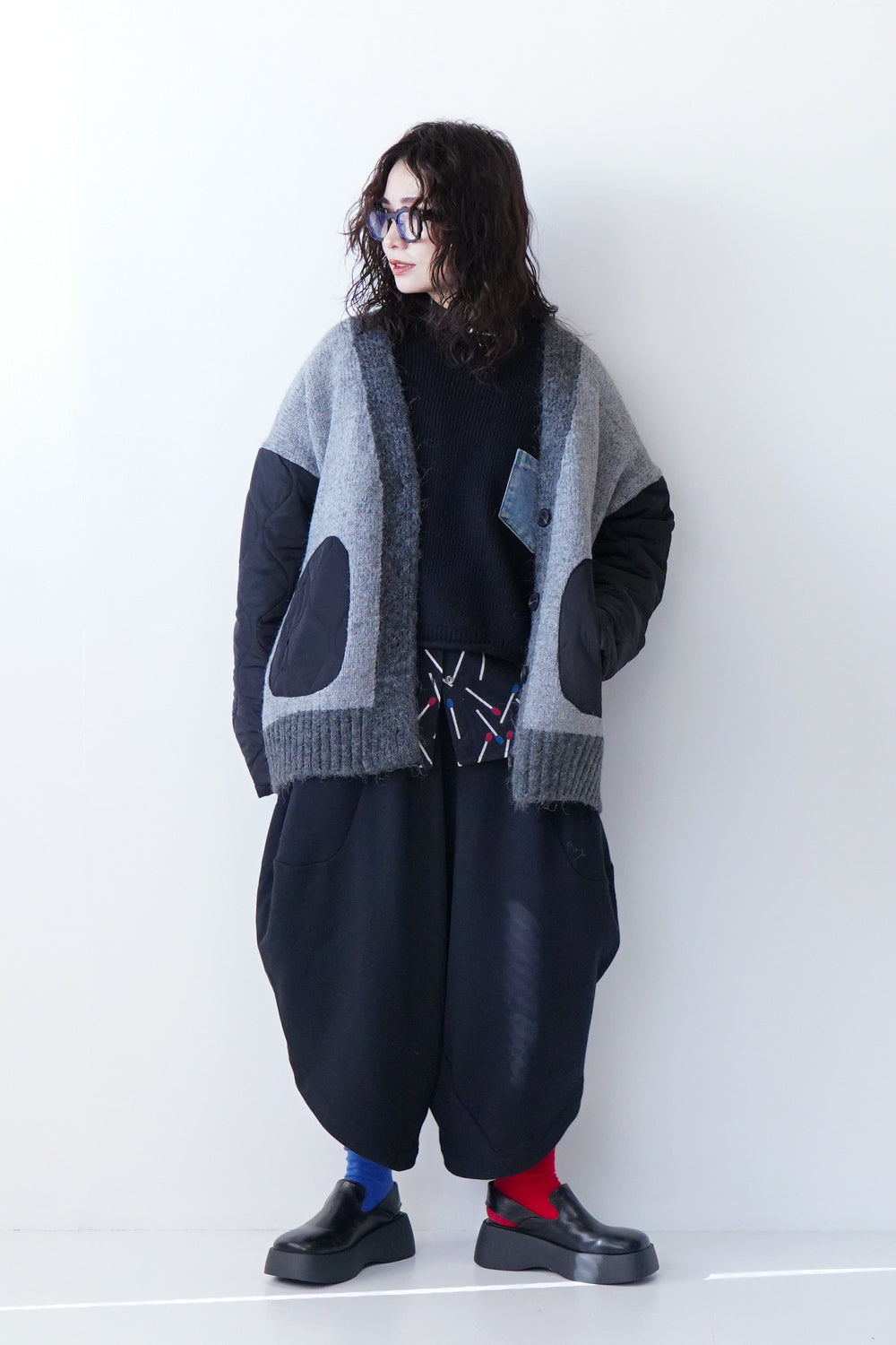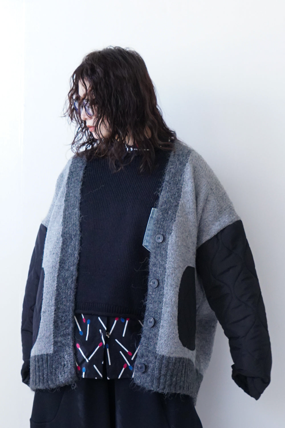 キルトとニットがドッキングした珍しいデザインのカーディガン。配色使いやくり抜きポケットなどデザインポイントが詰まった1枚。たっぷりの身幅とお尻まで隠れる丈感が体系カバーにも◎首元は深めのVネックですっきりと大人らしい印象に。