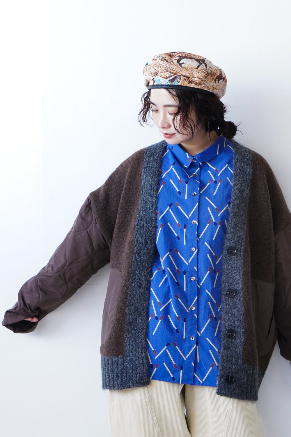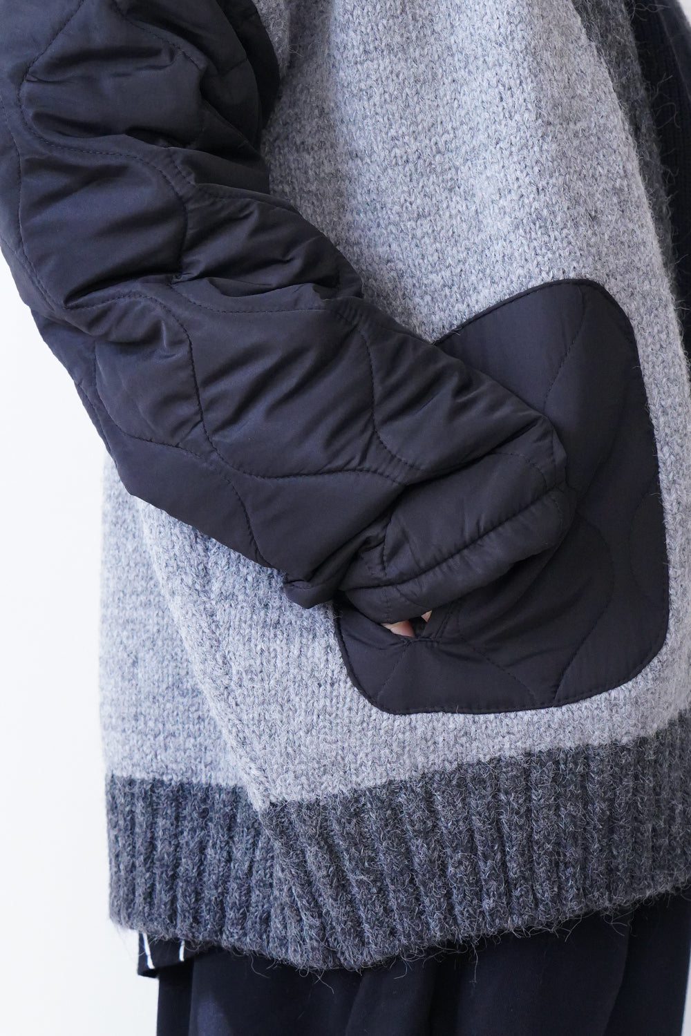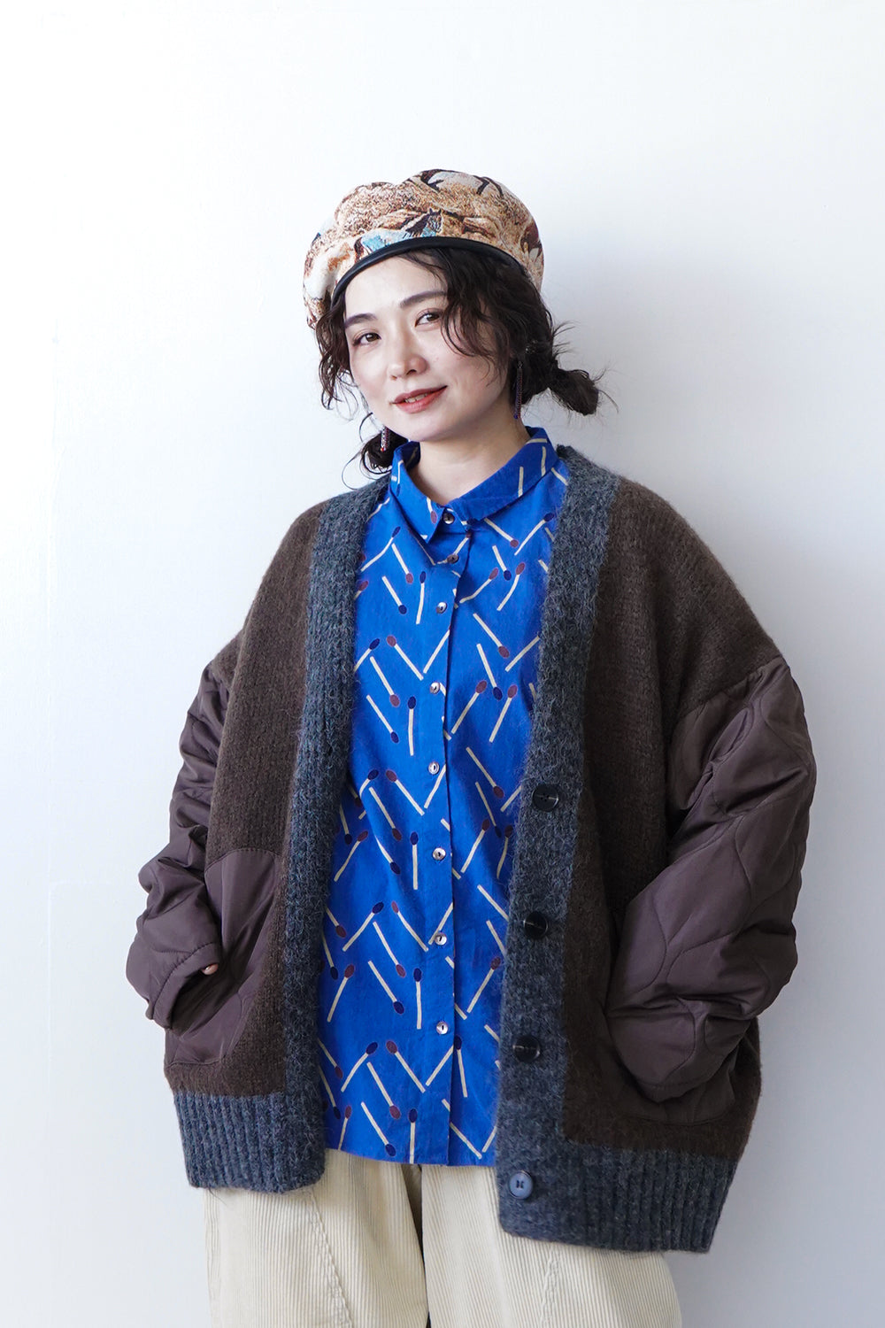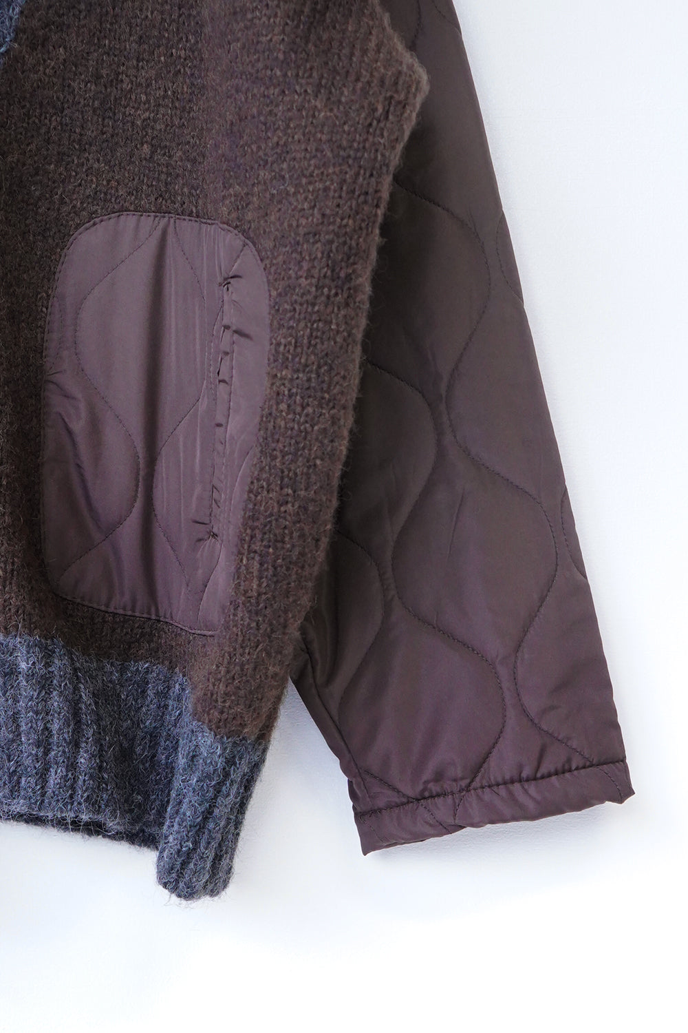 キルトとニットがドッキングした珍しいデザインのカーディガン。配色使いやくり抜きポケットなどデザインポイントが詰まった1枚。たっぷりの身幅とお尻まで隠れる丈感が体系カバーにも◎首元は深めのVネックですっきりと大人らしい印象に。