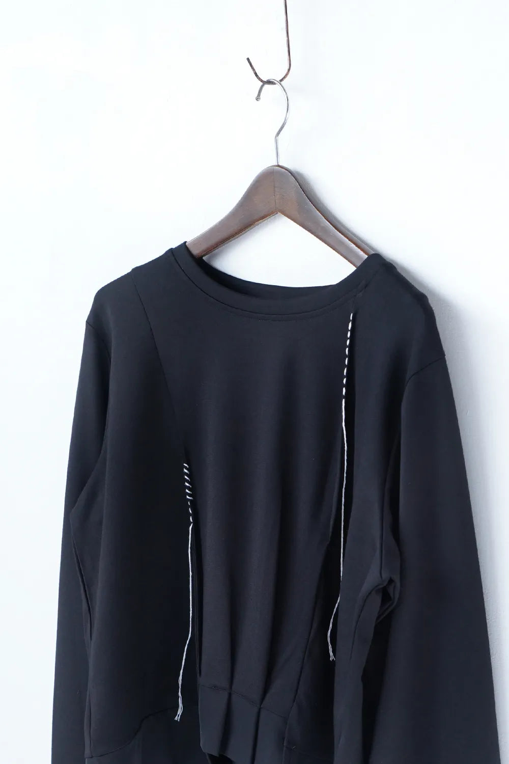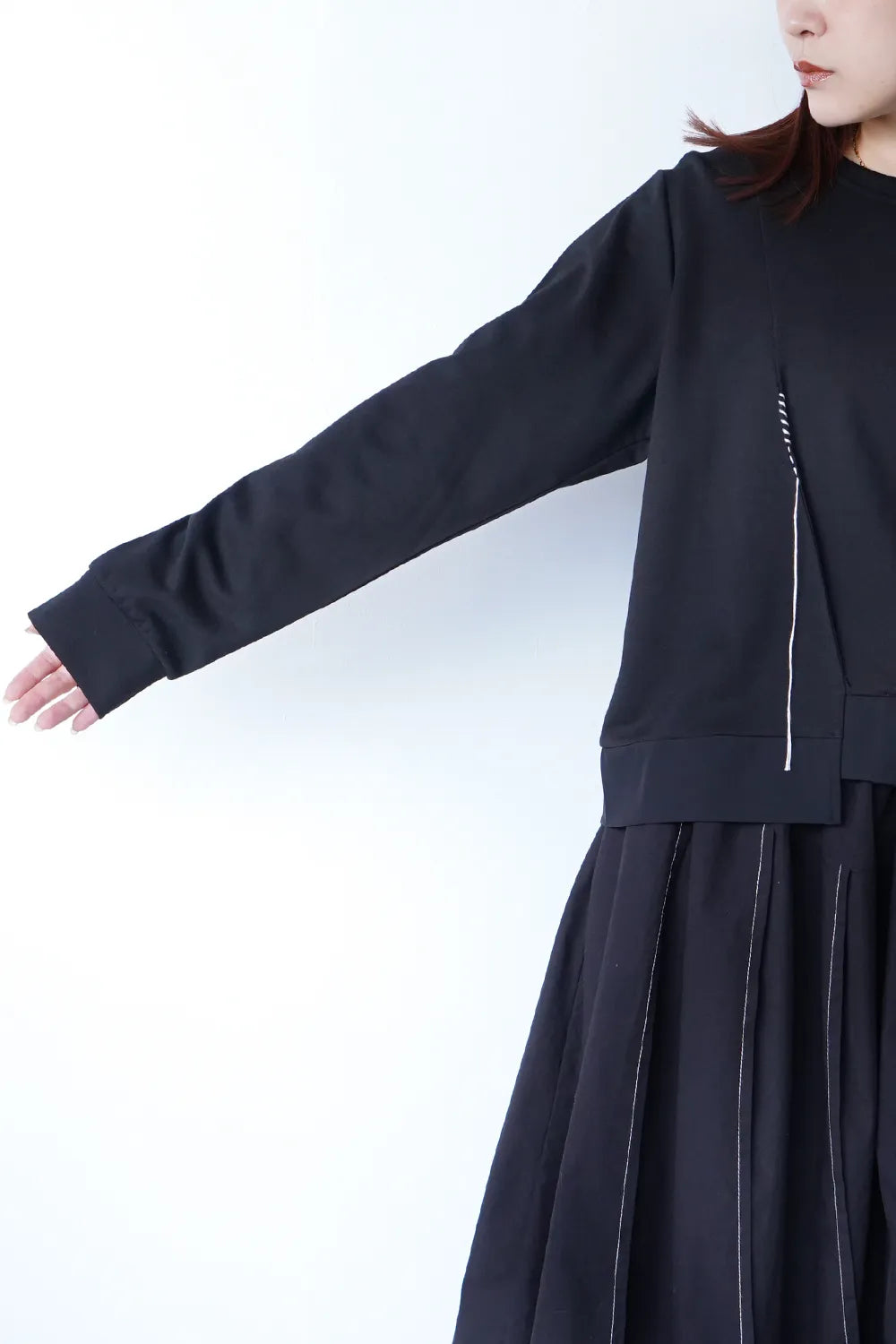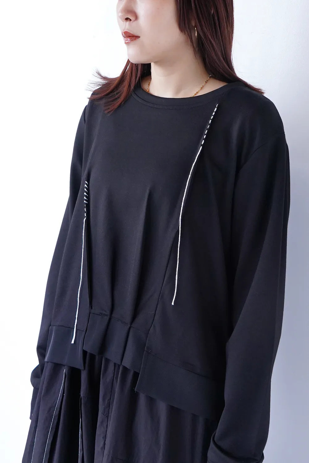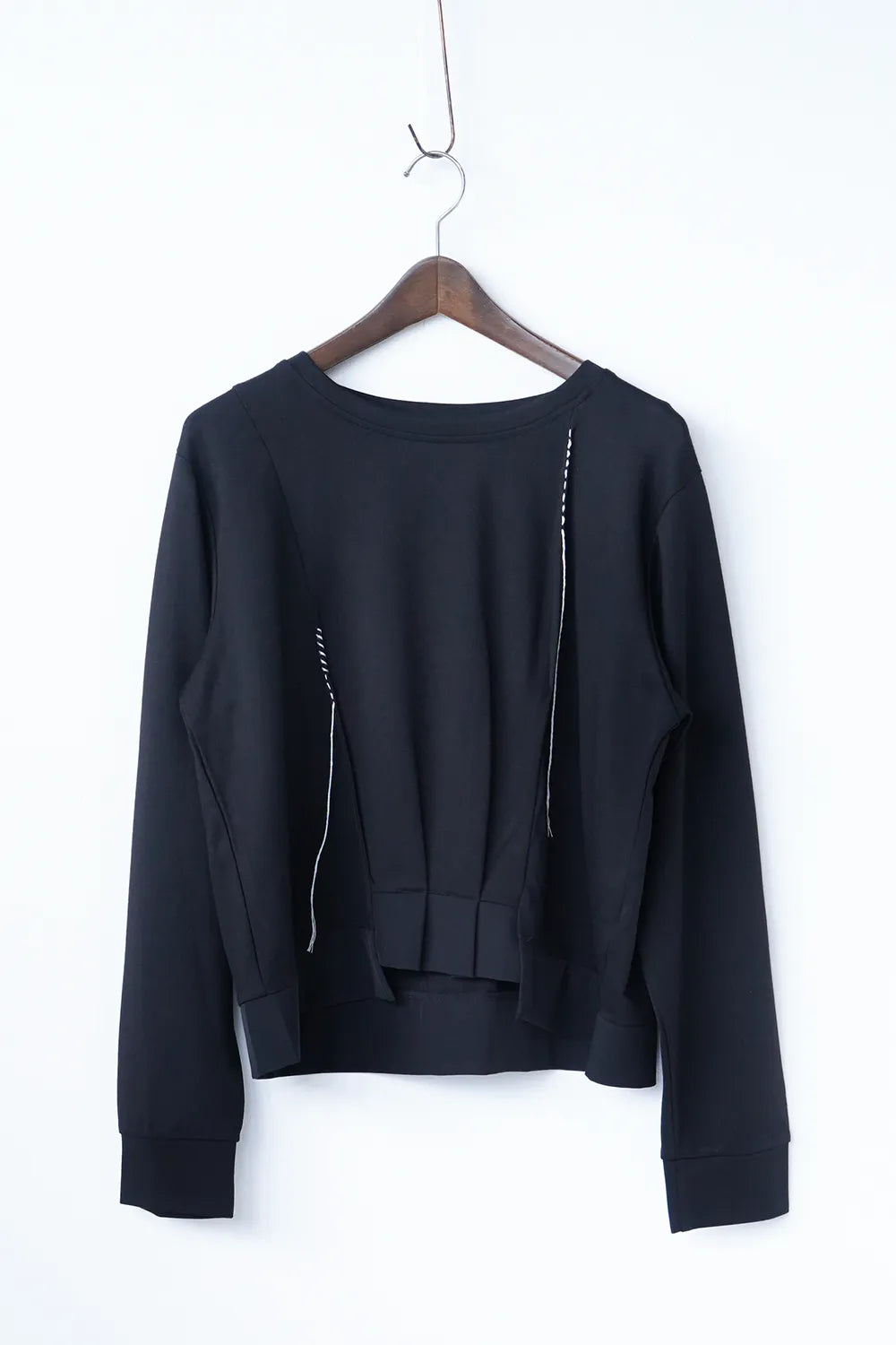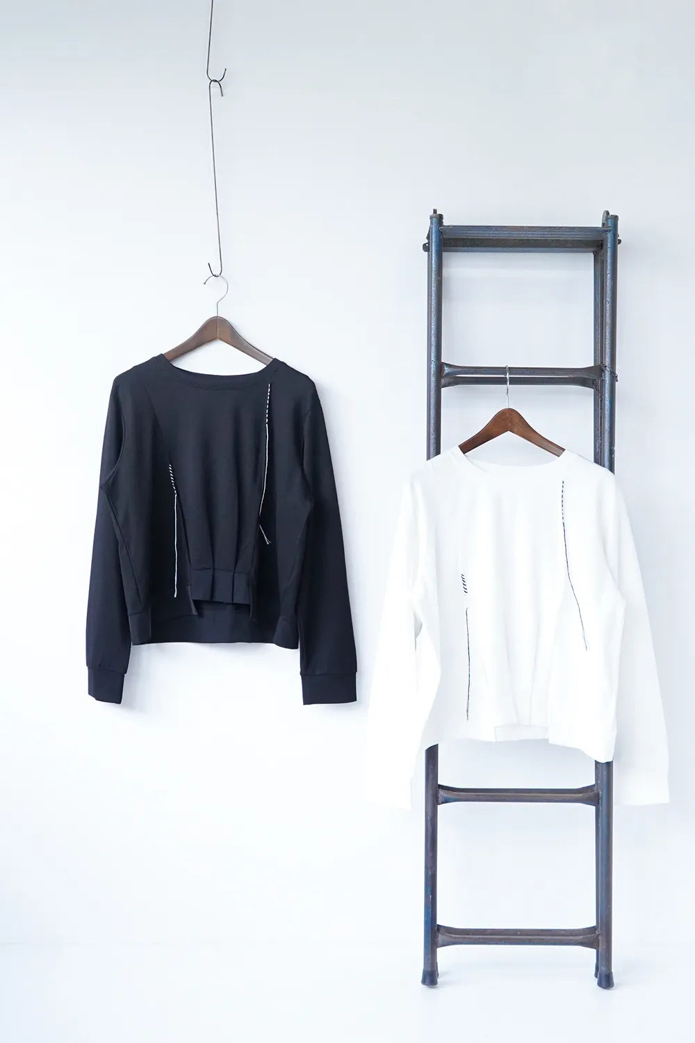 ステッチデザインがユニークなプルオーバー。サイズ感はゆったりとしていてポリエステル混のツルっとした素材感でややストレッチが効いています。裾にはタックが施されていてさりげないデザインポイントに◎薄手なので春夏向きのアイテムになります。