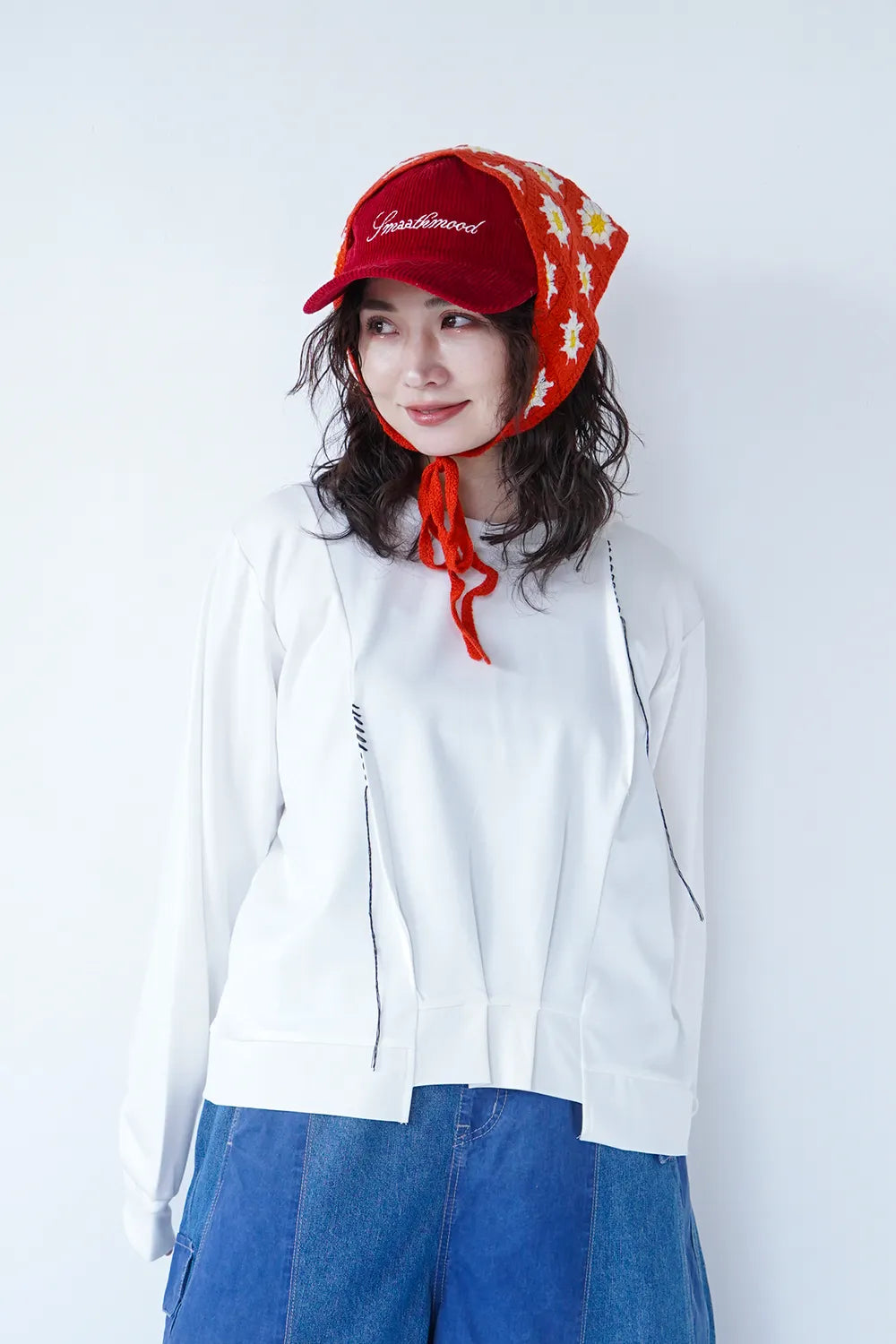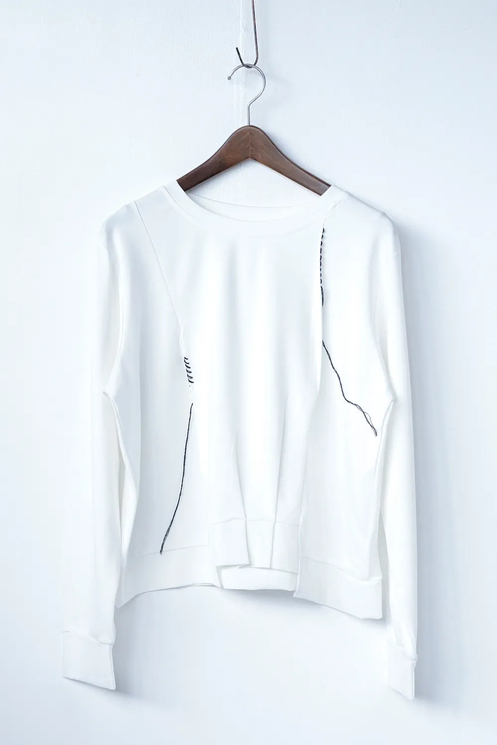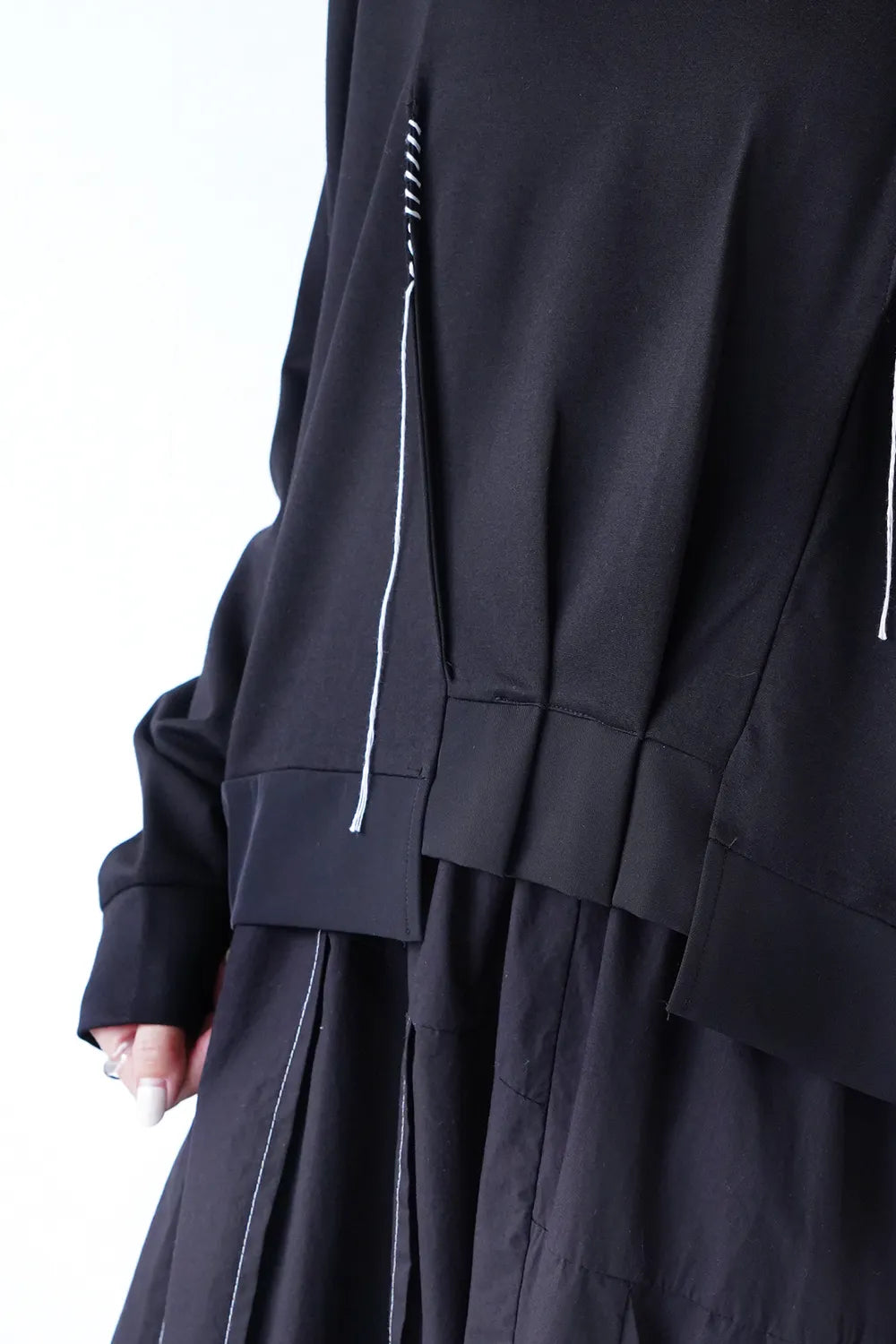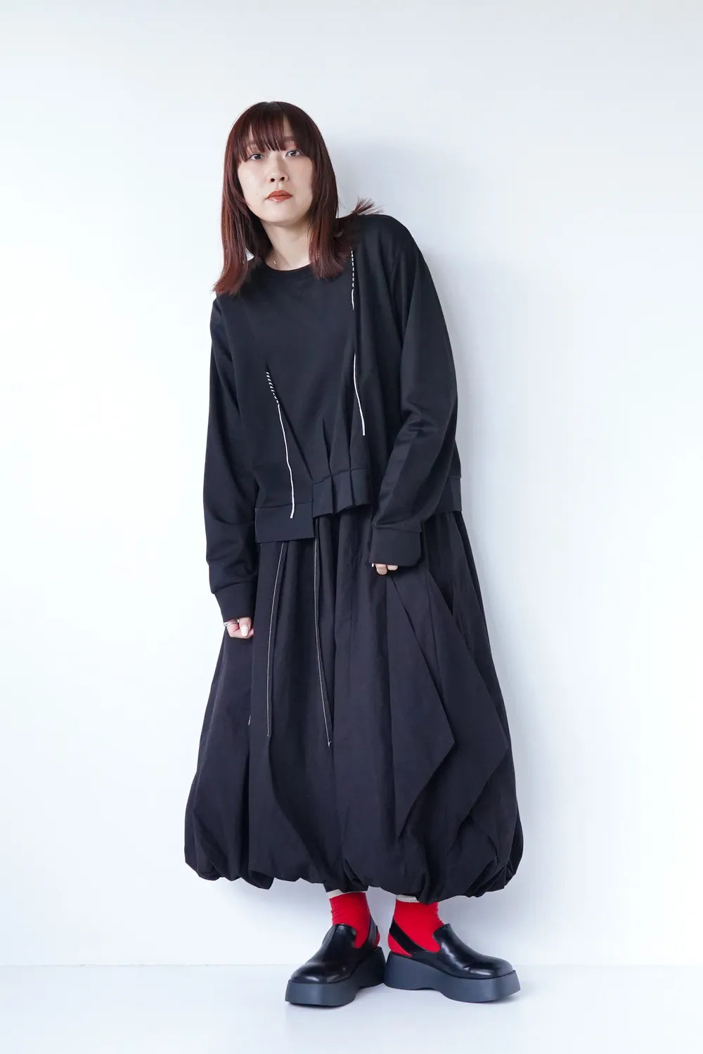 ステッチデザインがユニークなプルオーバー。サイズ感はゆったりとしていてポリエステル混のツルっとした素材感でややストレッチが効いています。裾にはタックが施されていてさりげないデザインポイントに◎薄手なので春夏向きのアイテムになります。