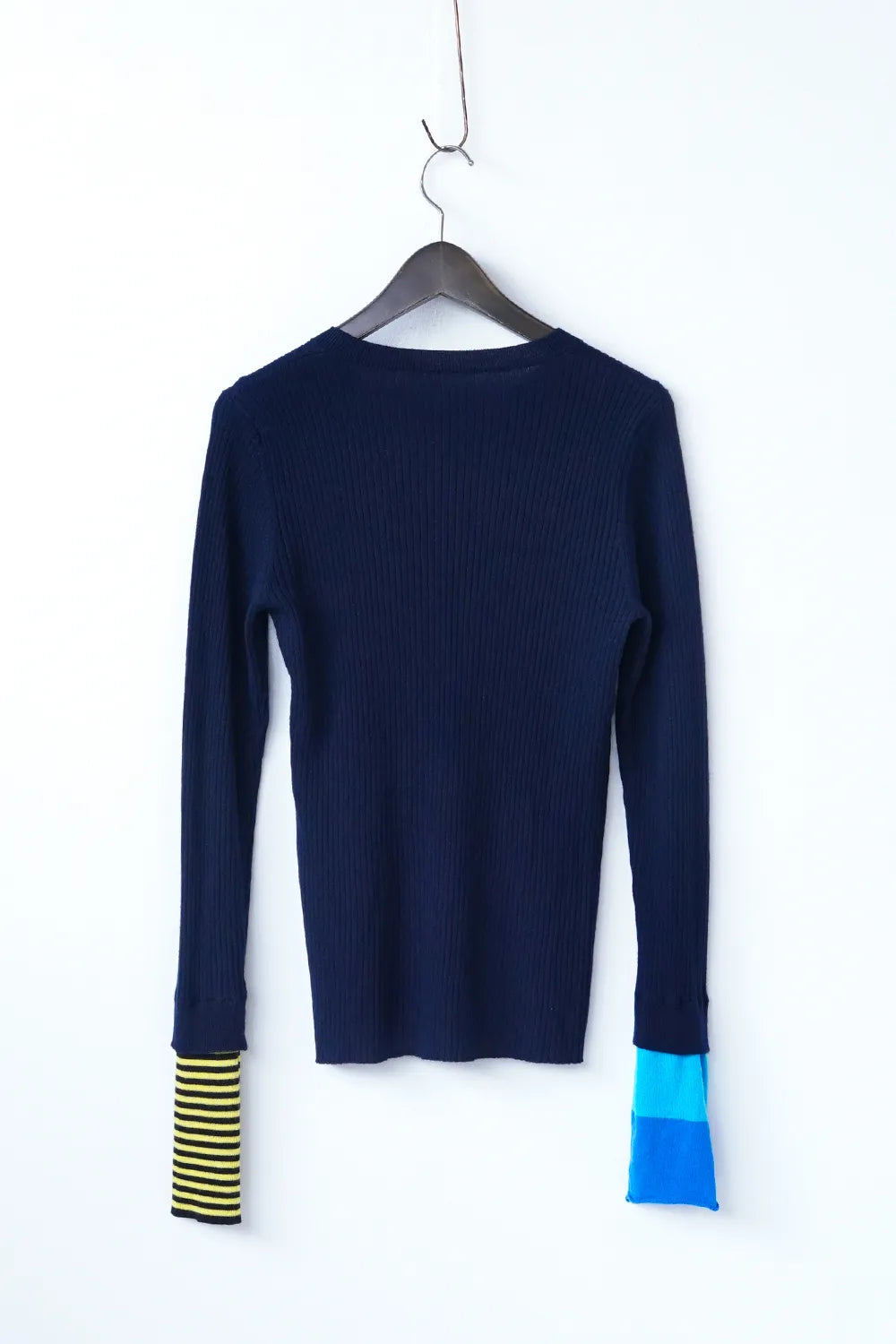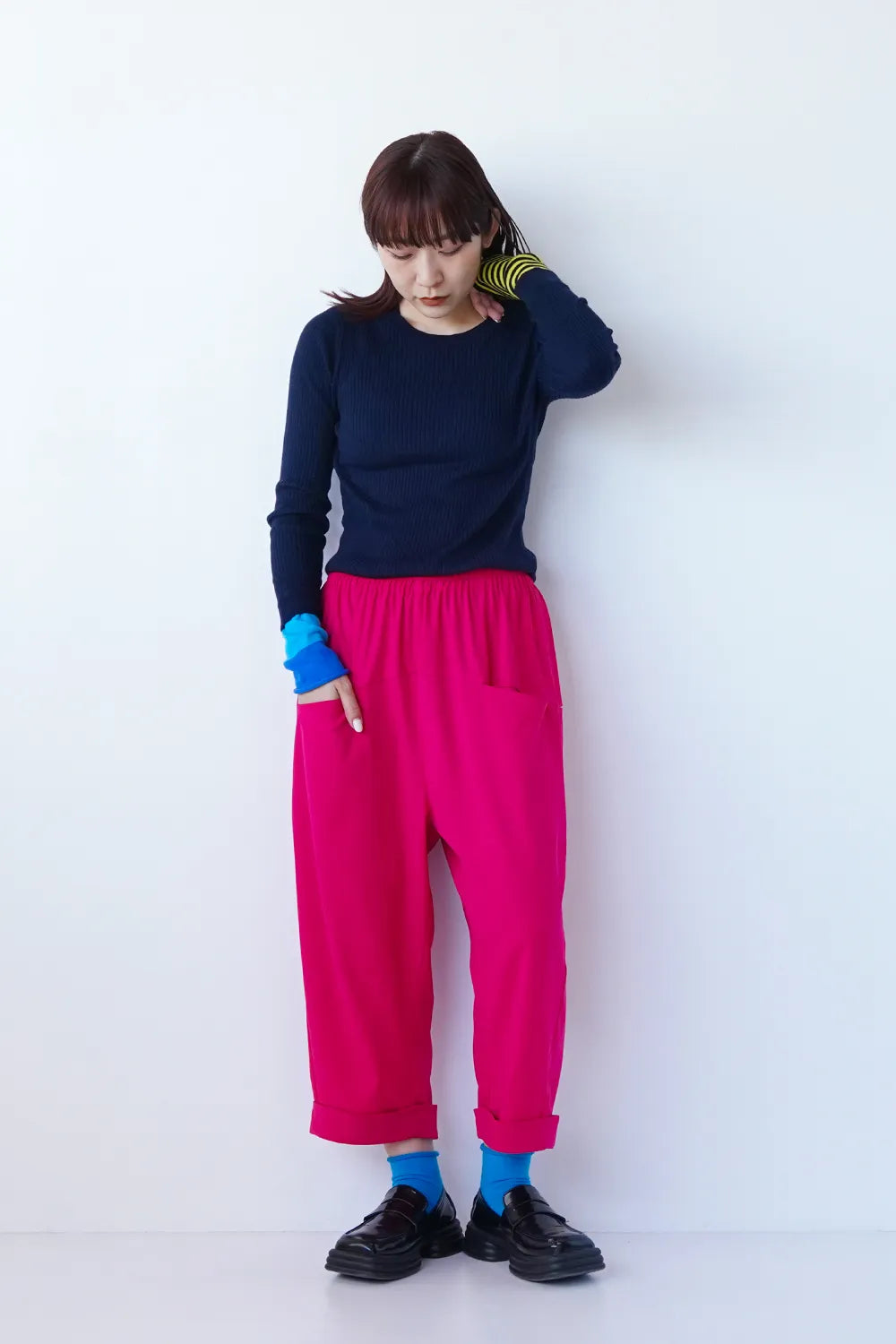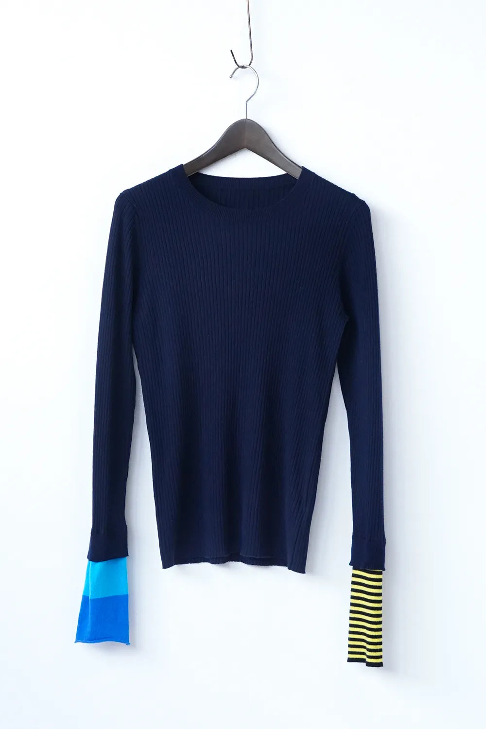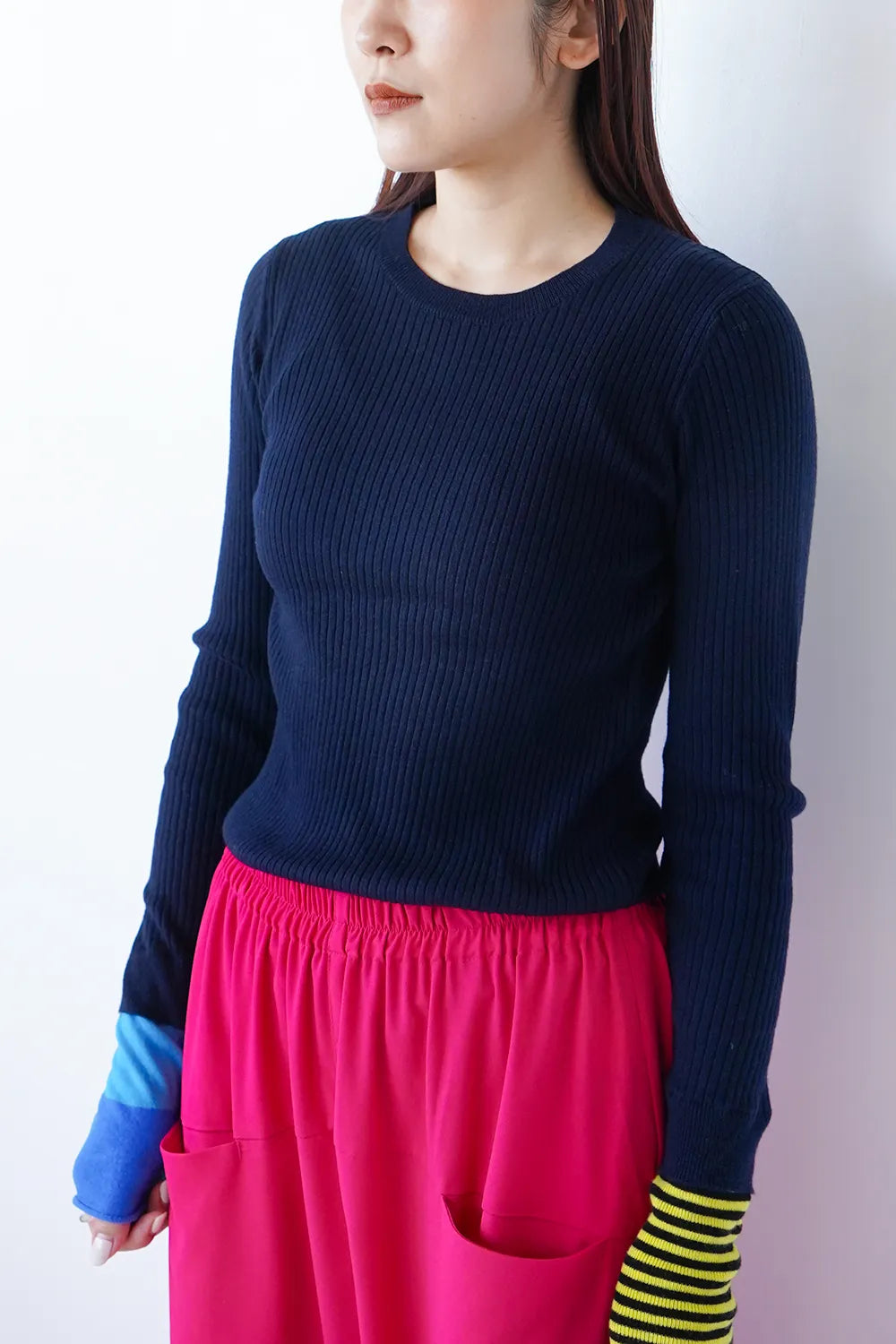 袖口のアシメ配色デザインがアクセントになったニットソー。1枚でももちろん、サロペットやベストに重ねてカラーデザインを活かした着こなしを楽しめます。コンパクトなサイズ感で女性らしい印象。柔らかくとても伸びるので着心地◎
