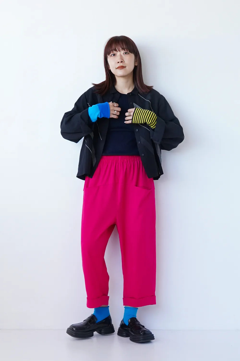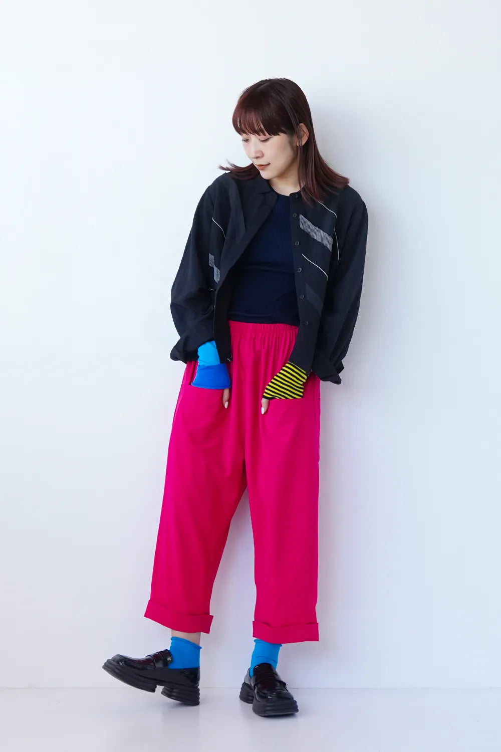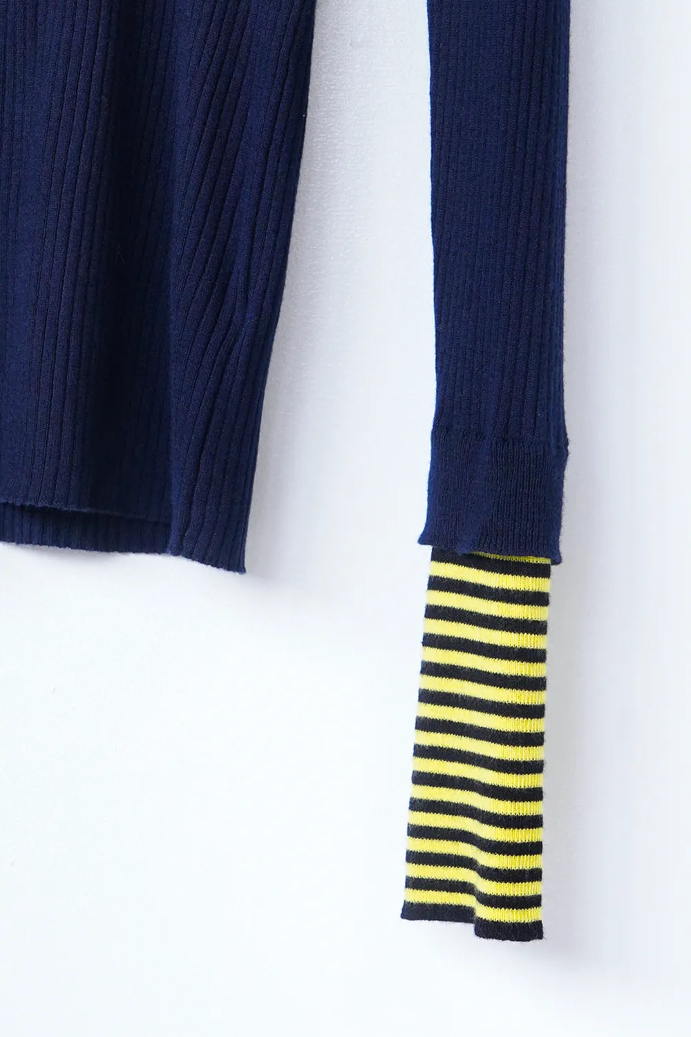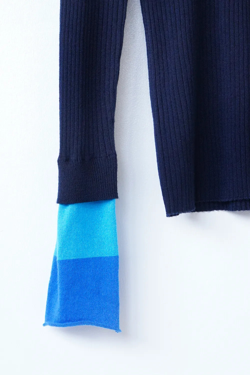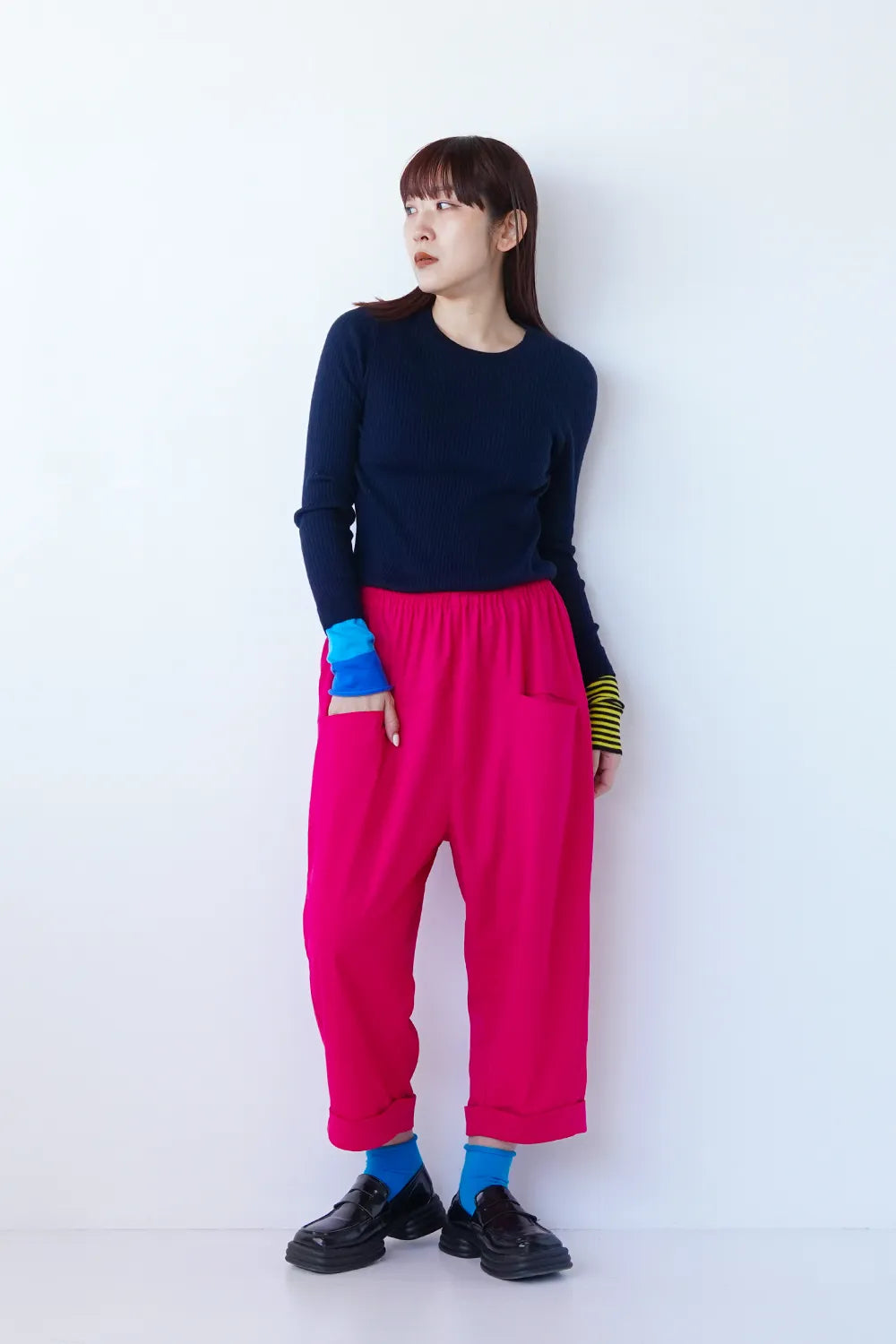 袖口のアシメ配色デザインがアクセントになったニットソー。1枚でももちろん、サロペットやベストに重ねてカラーデザインを活かした着こなしを楽しめます。コンパクトなサイズ感で女性らしい印象。柔らかくとても伸びるので着心地◎