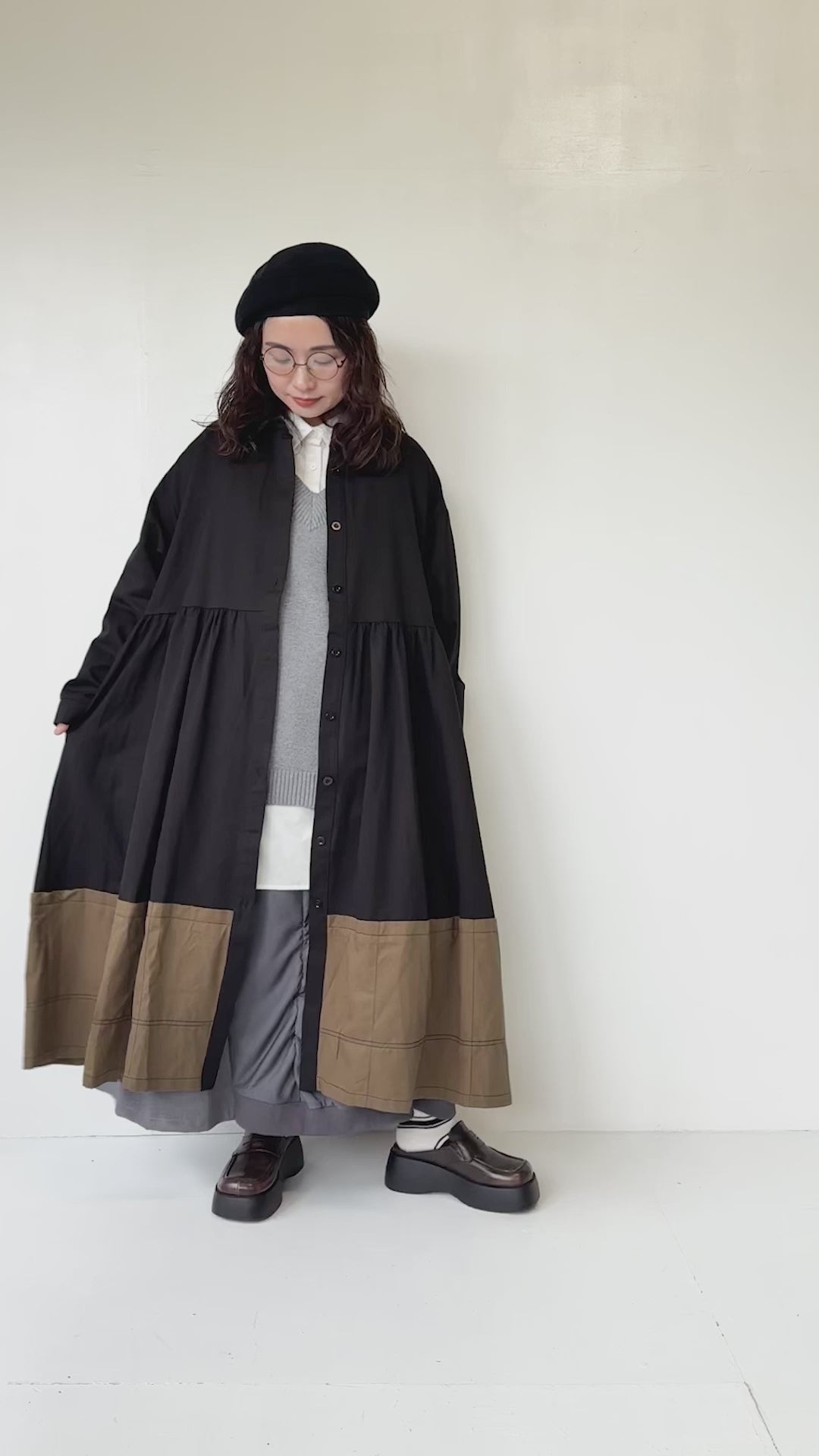 配色デザインが特徴的なシャツワンピース。コットンレーヨンの厚地の生地感でコート代わりで羽織りでも使えるしっかり素材。長めの着丈なので一枚でコーデが完成する主役級ワンピース。身幅もゆったりで着心地◎