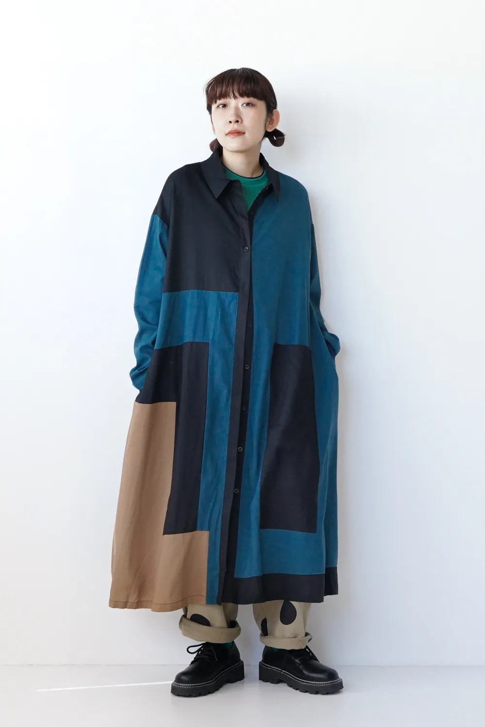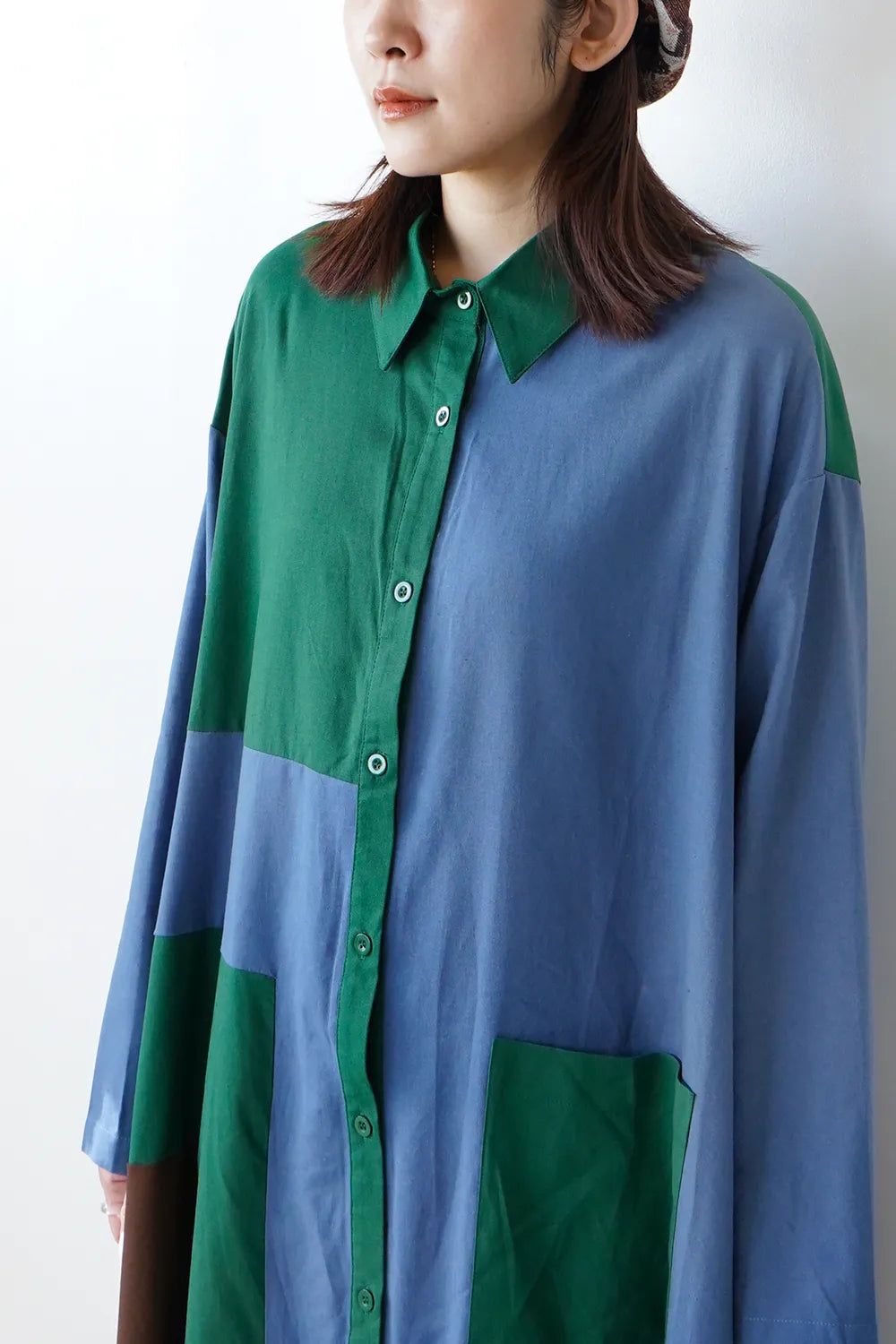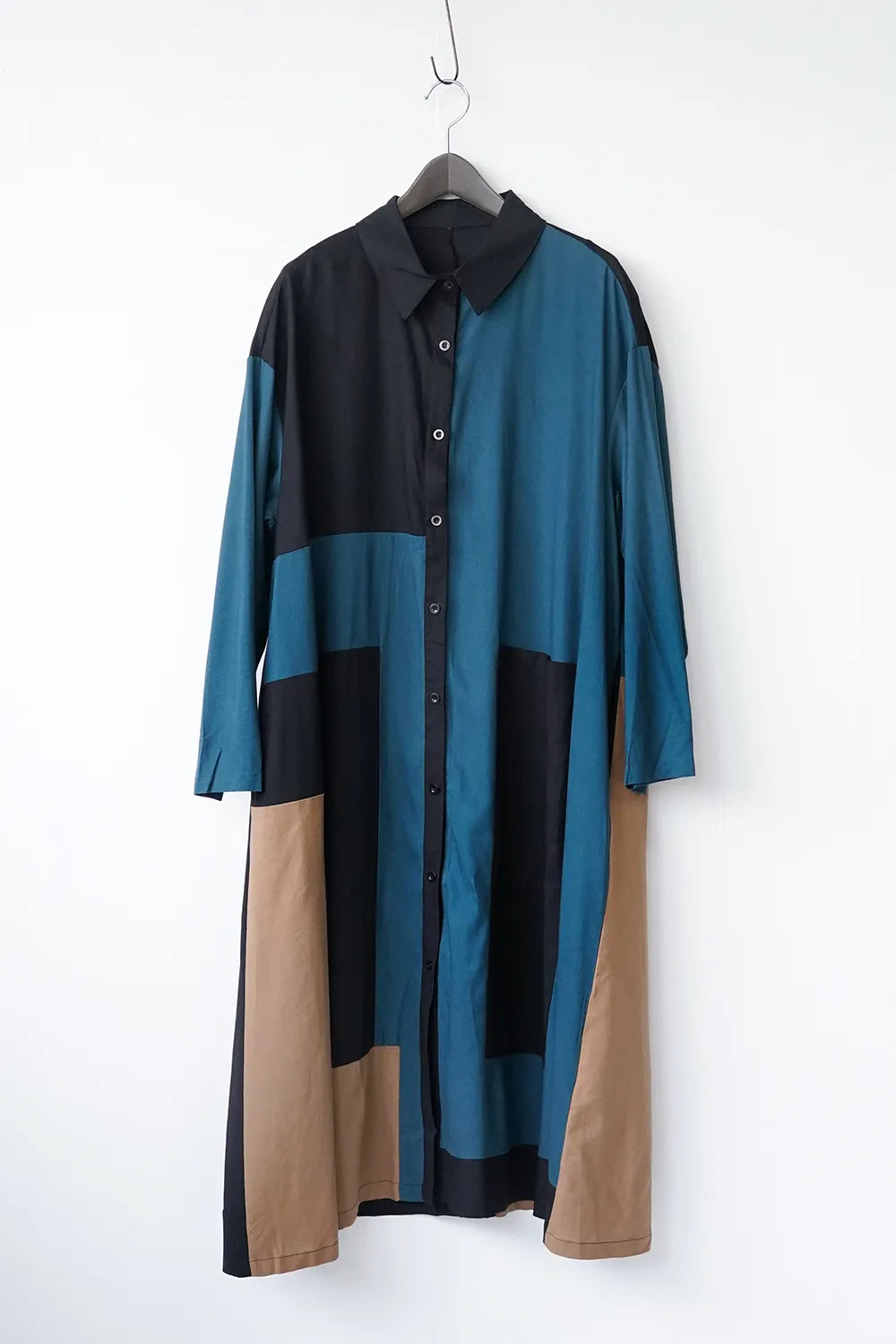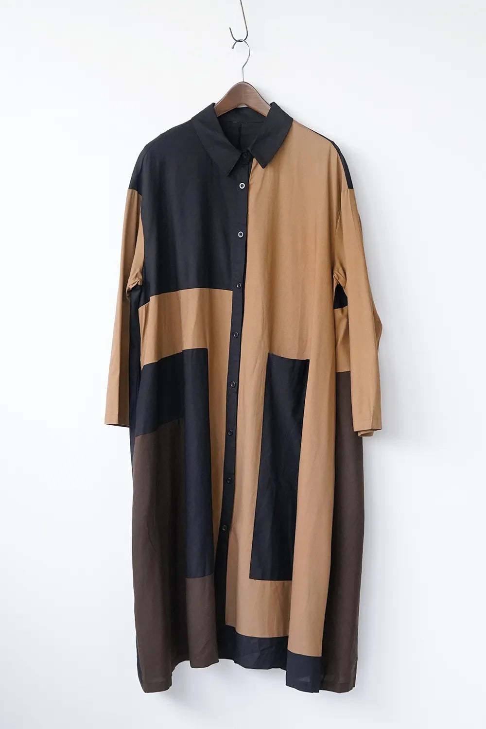 存在感のある大きな配色デザインが印象的なシャツワンピース。身幅をしっかりと取り、身体のラインを拾わないAラインシルエット。幾何学模様のようなブロック切替に異なる色の組み合わせが個性的な1枚。リネン混の通気性のある薄手の生地感生地感なのでロングシーズン楽しめます。両サイドには便利なポケット付き。