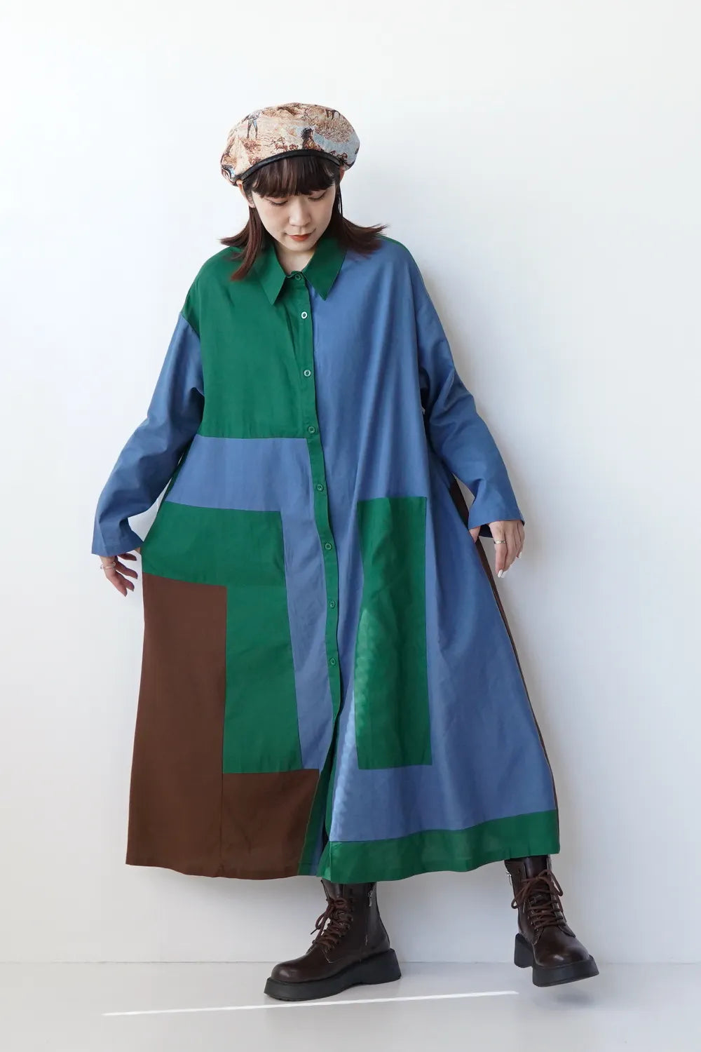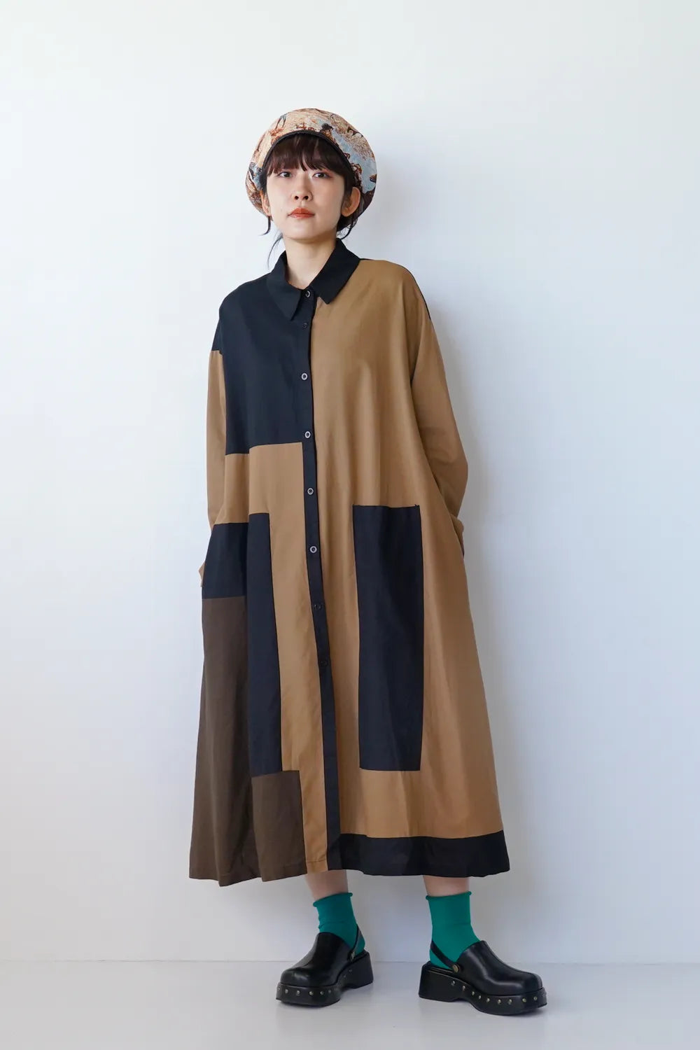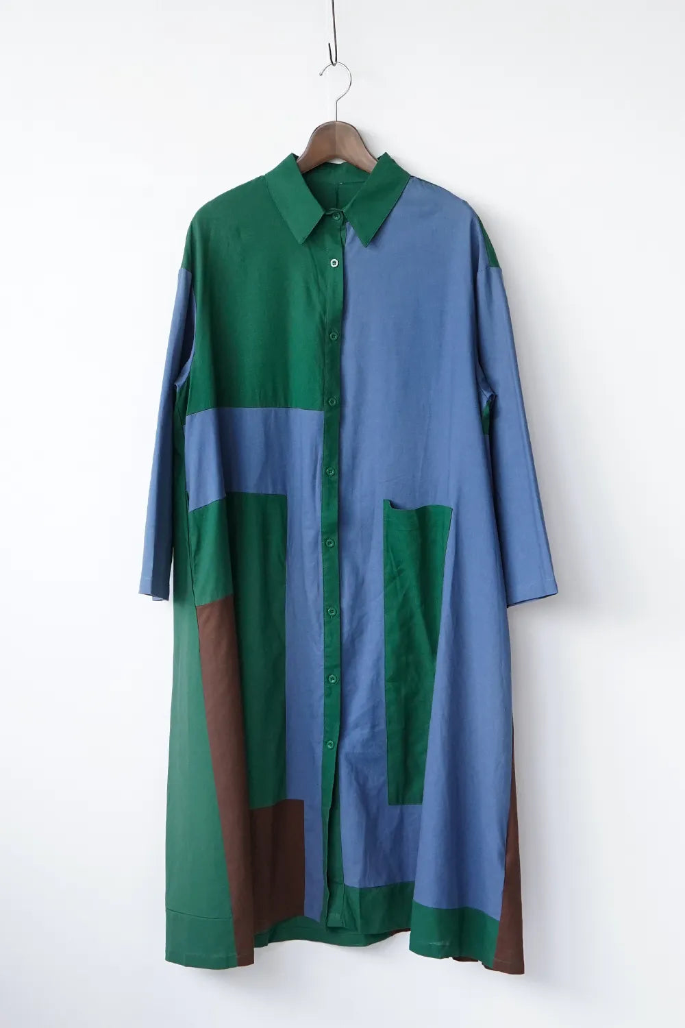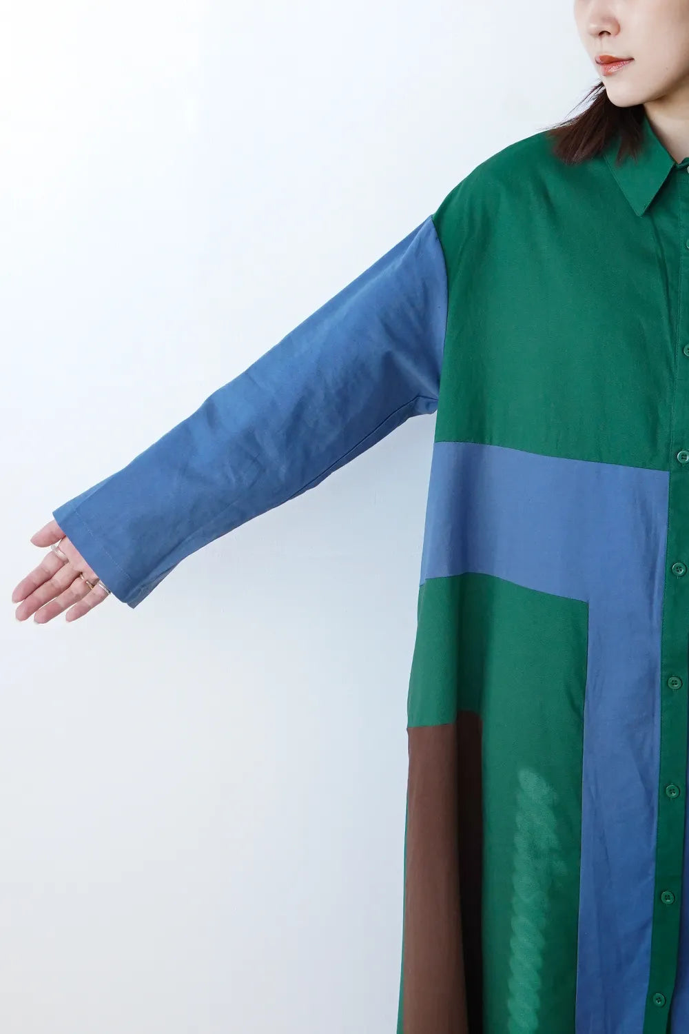 存在感のある大きな配色デザインが印象的なシャツワンピース。身幅をしっかりと取り、身体のラインを拾わないAラインシルエット。幾何学模様のようなブロック切替に異なる色の組み合わせが個性的な1枚。リネン混の通気性のある薄手の生地感生地感なのでロングシーズン楽しめます。両サイドには便利なポケット付き。