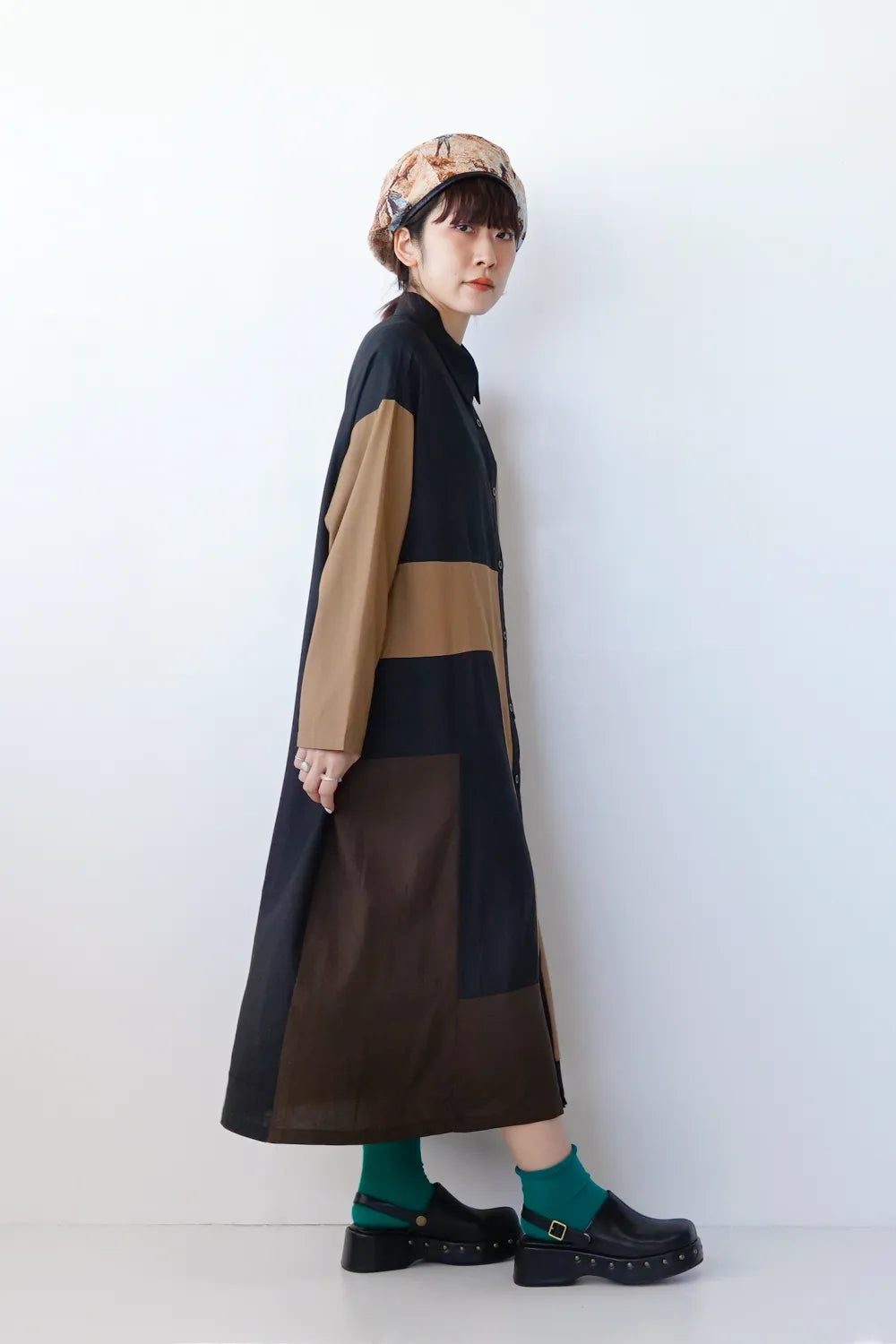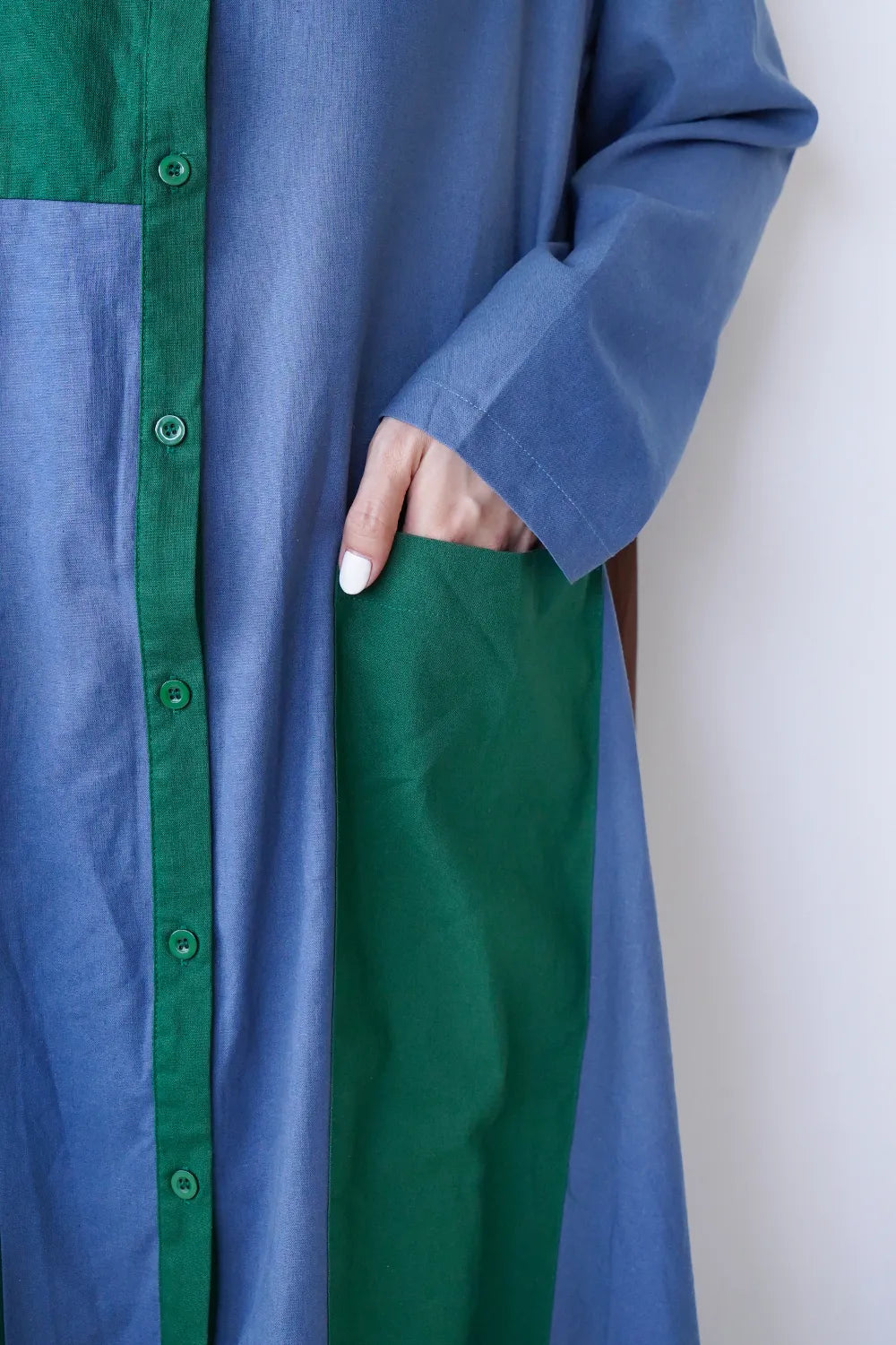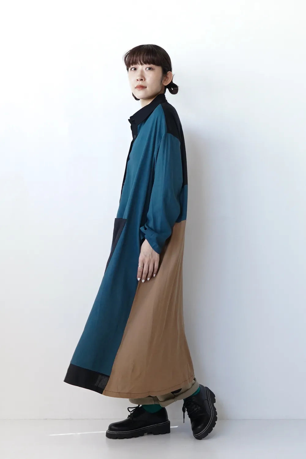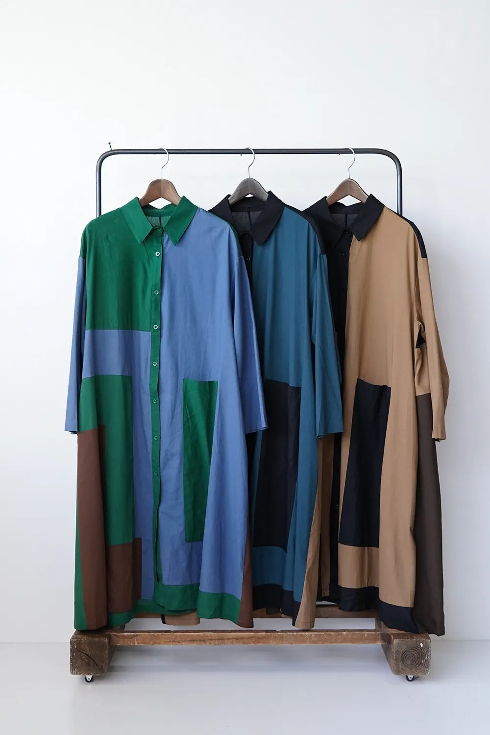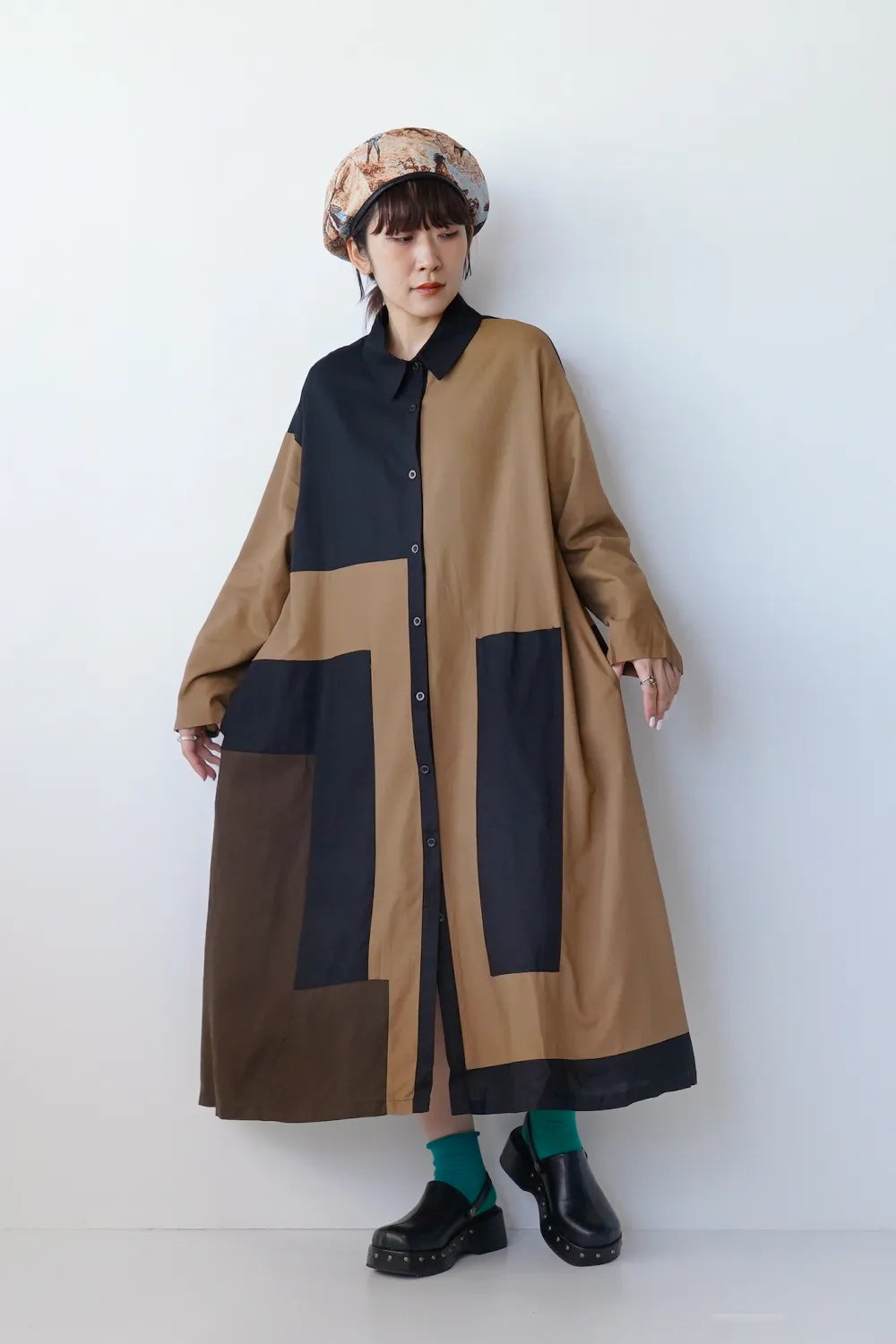 存在感のある大きな配色デザインが印象的なシャツワンピース。身幅をしっかりと取り、身体のラインを拾わないAラインシルエット。幾何学模様のようなブロック切替に異なる色の組み合わせが個性的な1枚。リネン混の通気性のある薄手の生地感生地感なのでロングシーズン楽しめます。両サイドには便利なポケット付き。