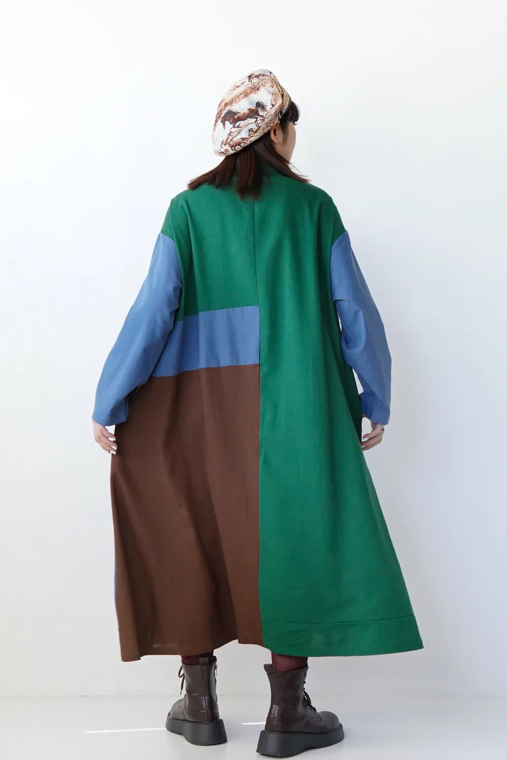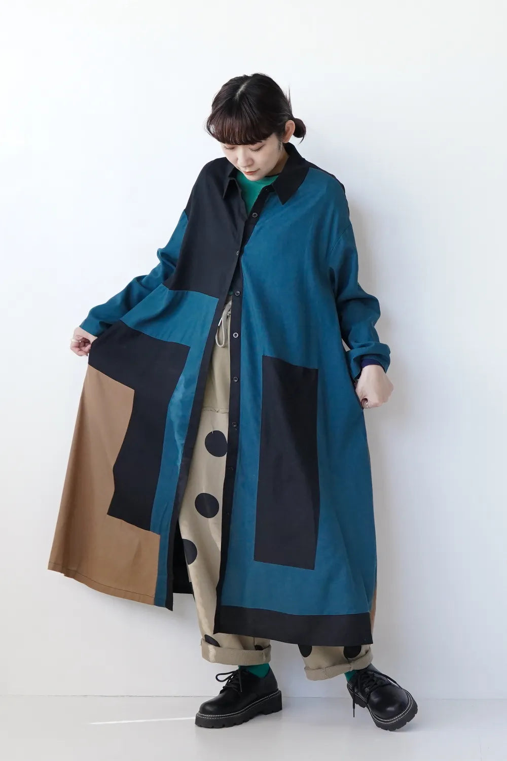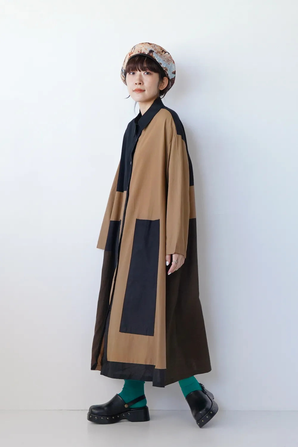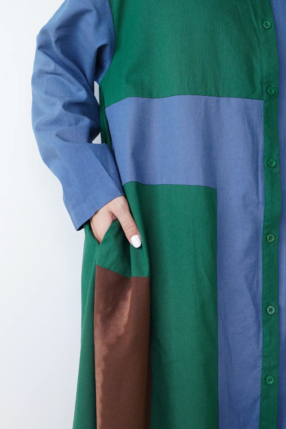 存在感のある大きな配色デザインが印象的なシャツワンピース。身幅をしっかりと取り、身体のラインを拾わないAラインシルエット。幾何学模様のようなブロック切替に異なる色の組み合わせが個性的な1枚。リネン混の通気性のある薄手の生地感生地感なのでロングシーズン楽しめます。両サイドには便利なポケット付き。