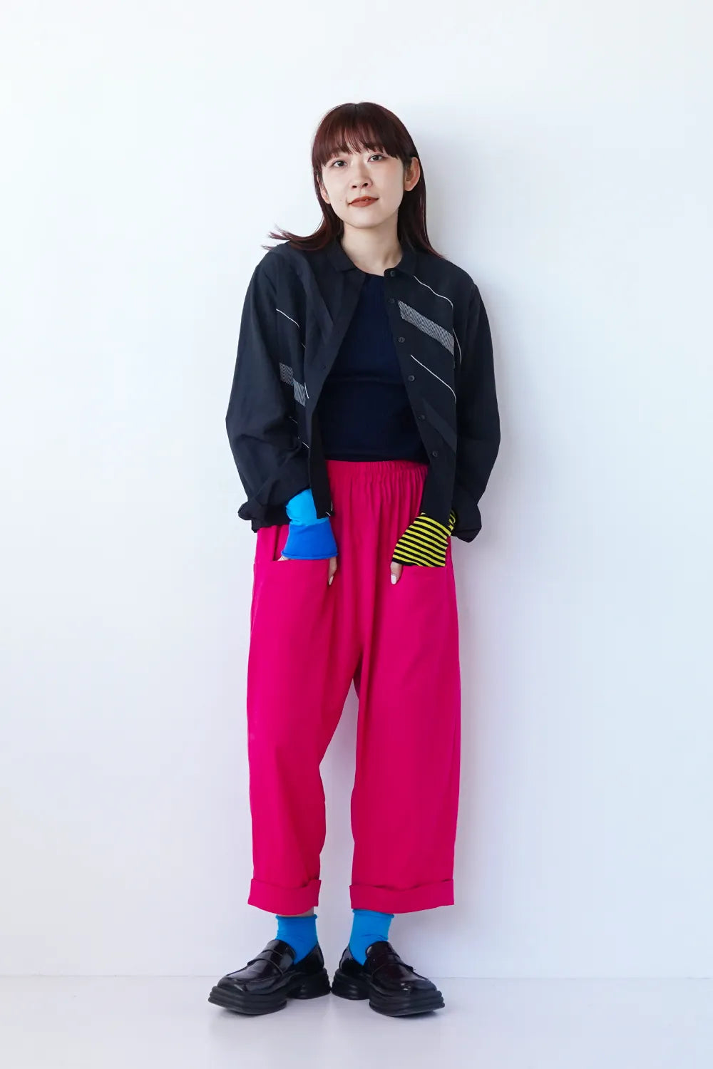 ワイドなシャツのシルエットを活かして羽織る着回しに!袖から出したインナーの袖配色がポイント◎ボトムにはオリジナルのビビットピンクパンツを投入して色で遊ぶスタイリングに!