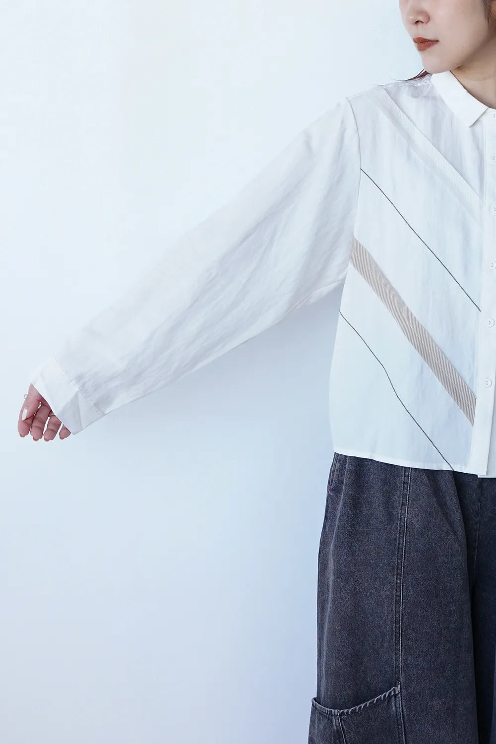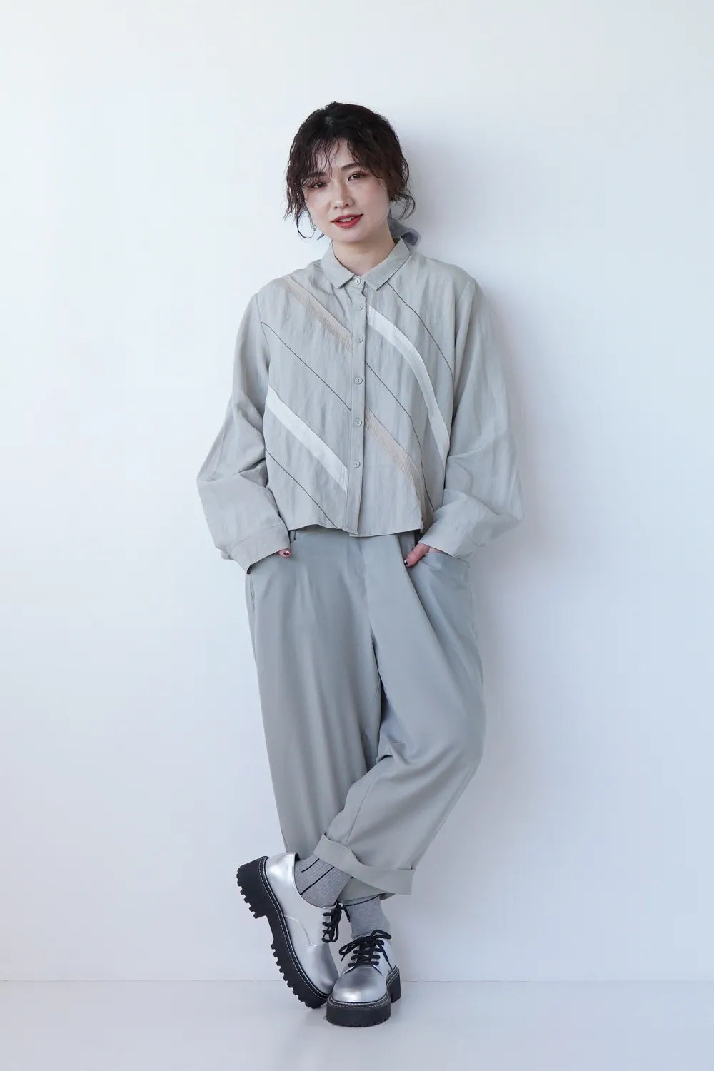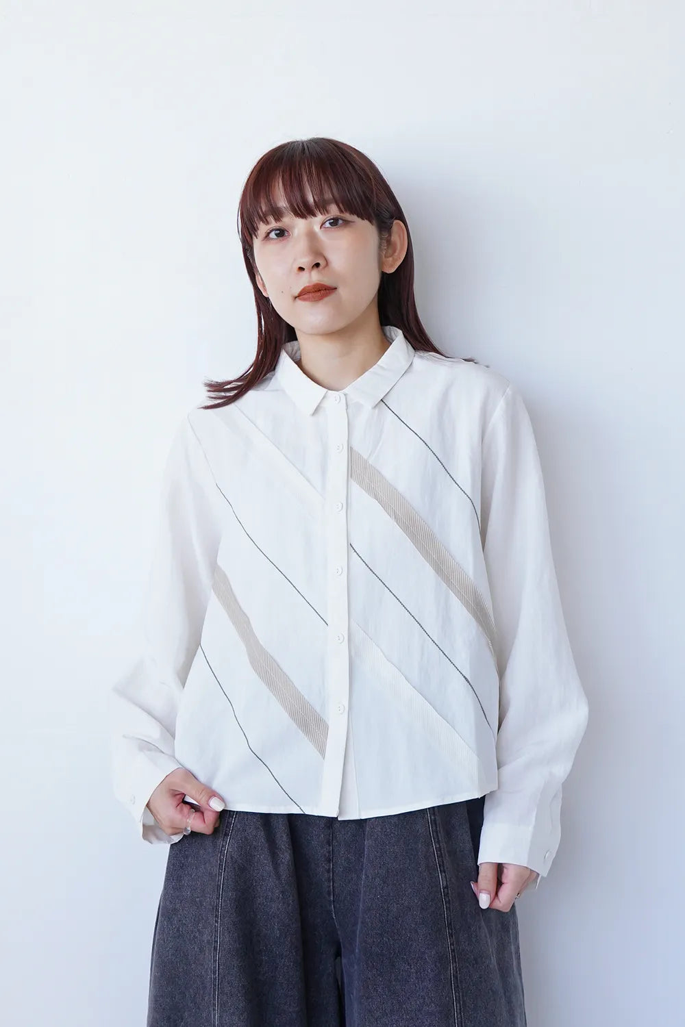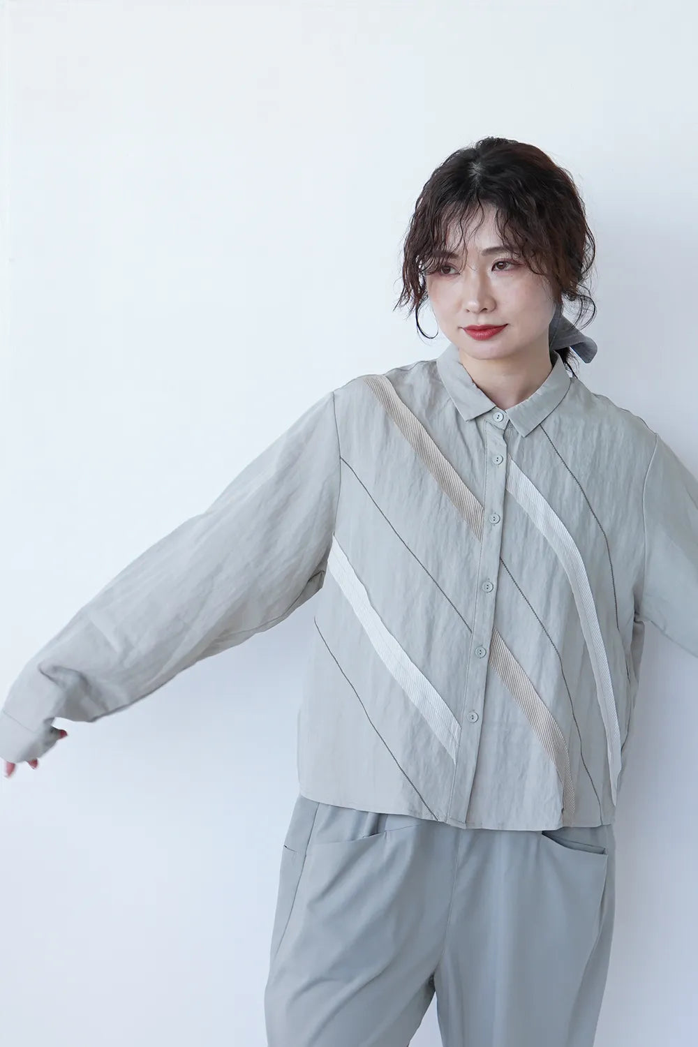 大胆に斜めにデザインされたラインが個性的なシャツ。レーヨン混の滑らかな素材感で春夏向けのさらっとした生地感。身幅は体のラインを拾わないゆったりサイズで、着丈はやや短めのシルエット。ロングシーズン活躍できそうな1枚です。