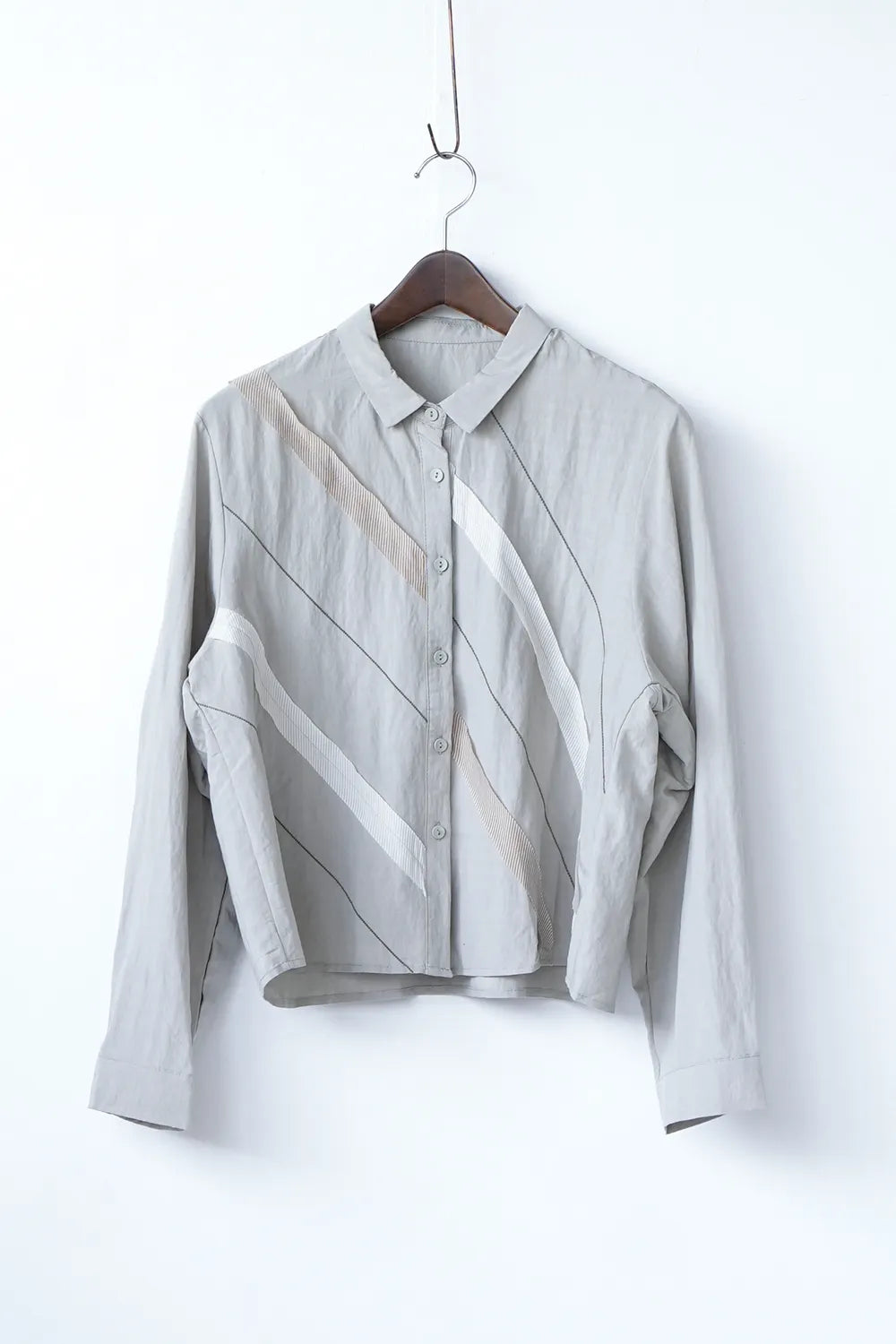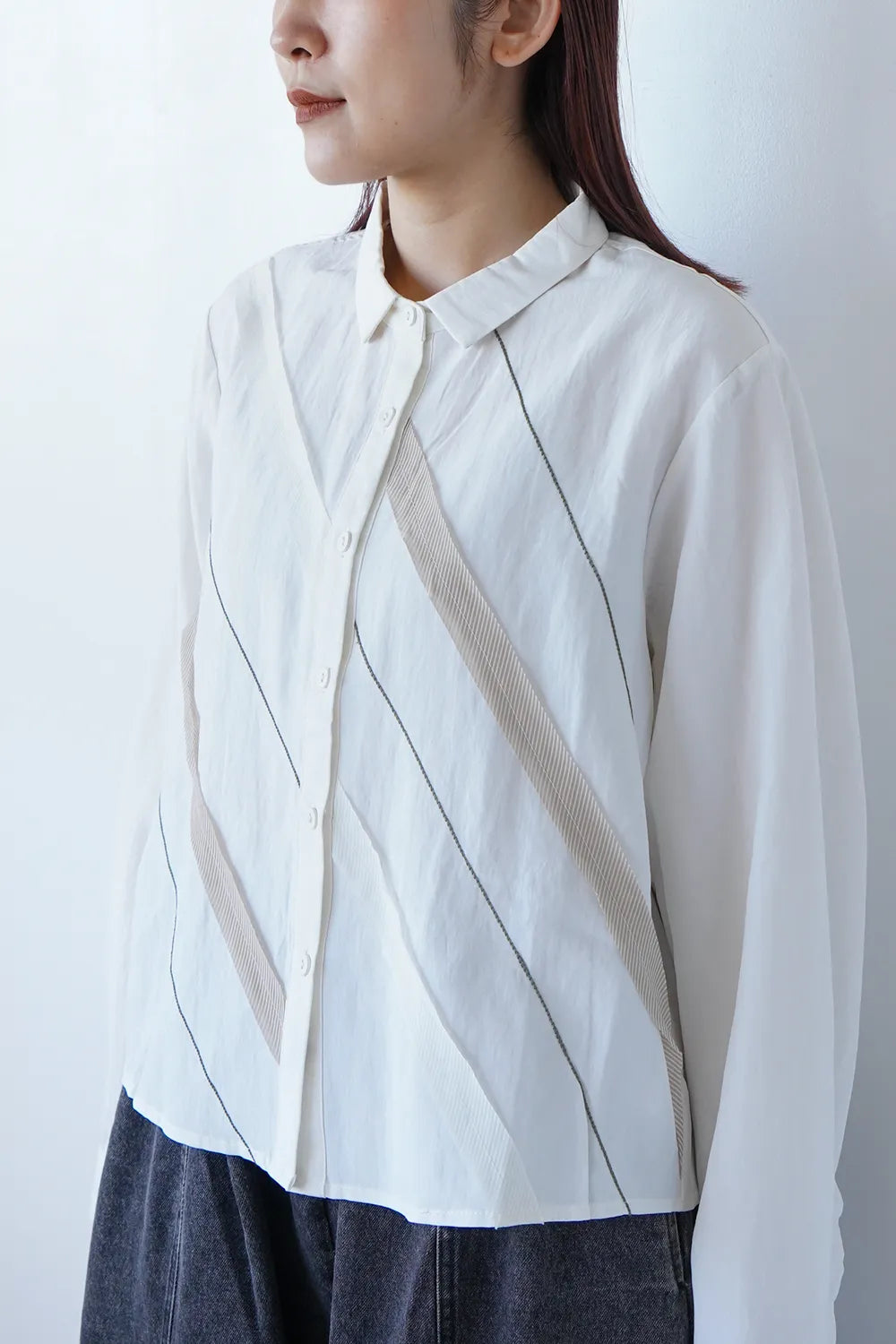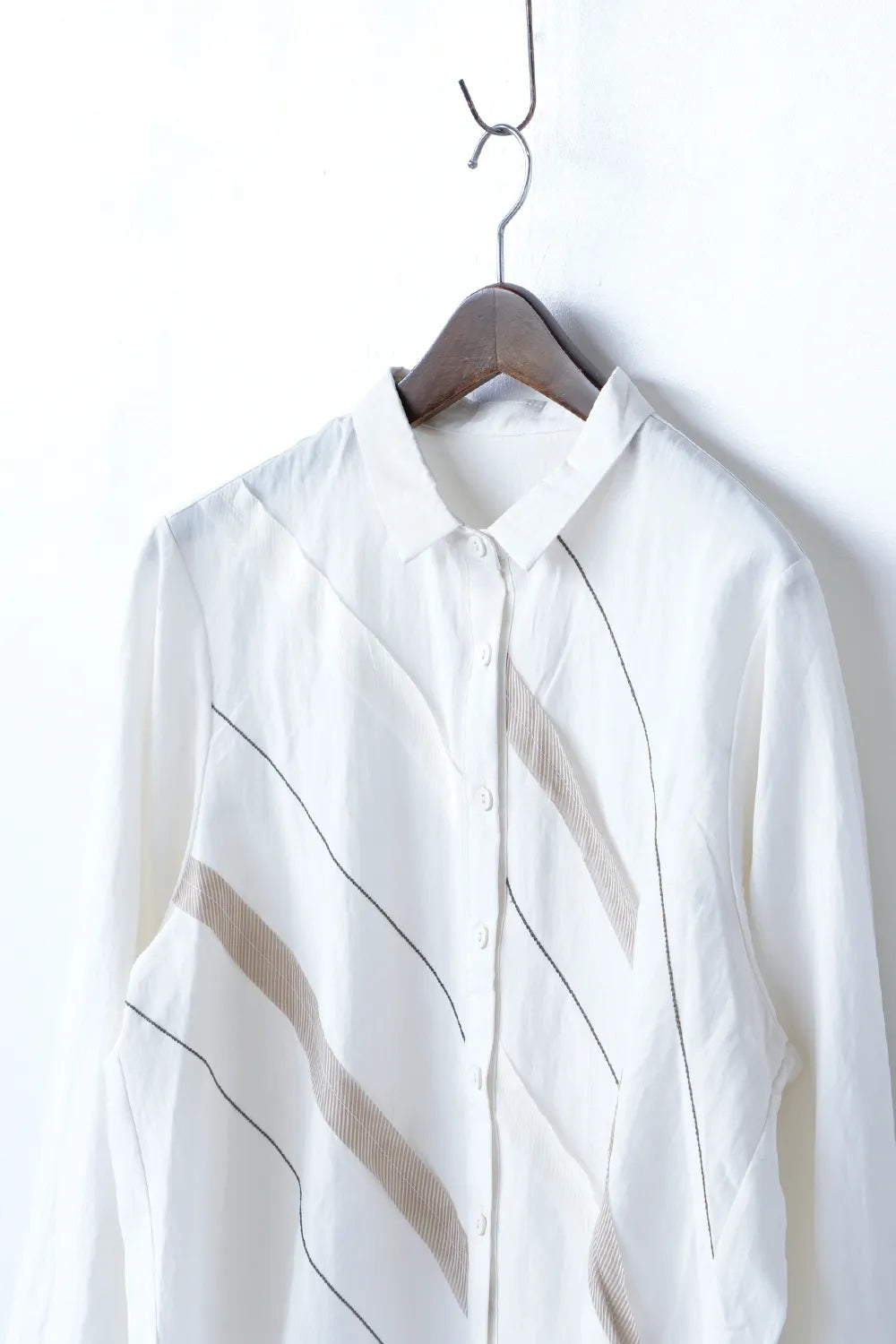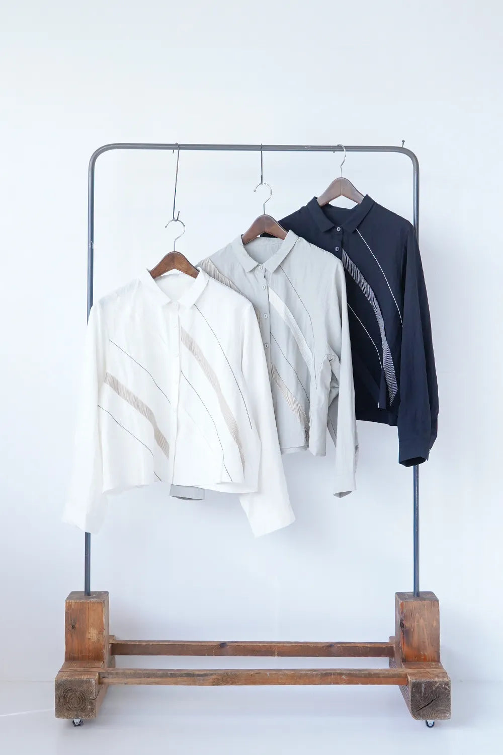 大胆に斜めにデザインされたラインが個性的なシャツ。レーヨン混の滑らかな素材感で春夏向けのさらっとした生地感。身幅は体のラインを拾わないゆったりサイズで、着丈はやや短めのシルエット。ロングシーズン活躍できそうな1枚です。