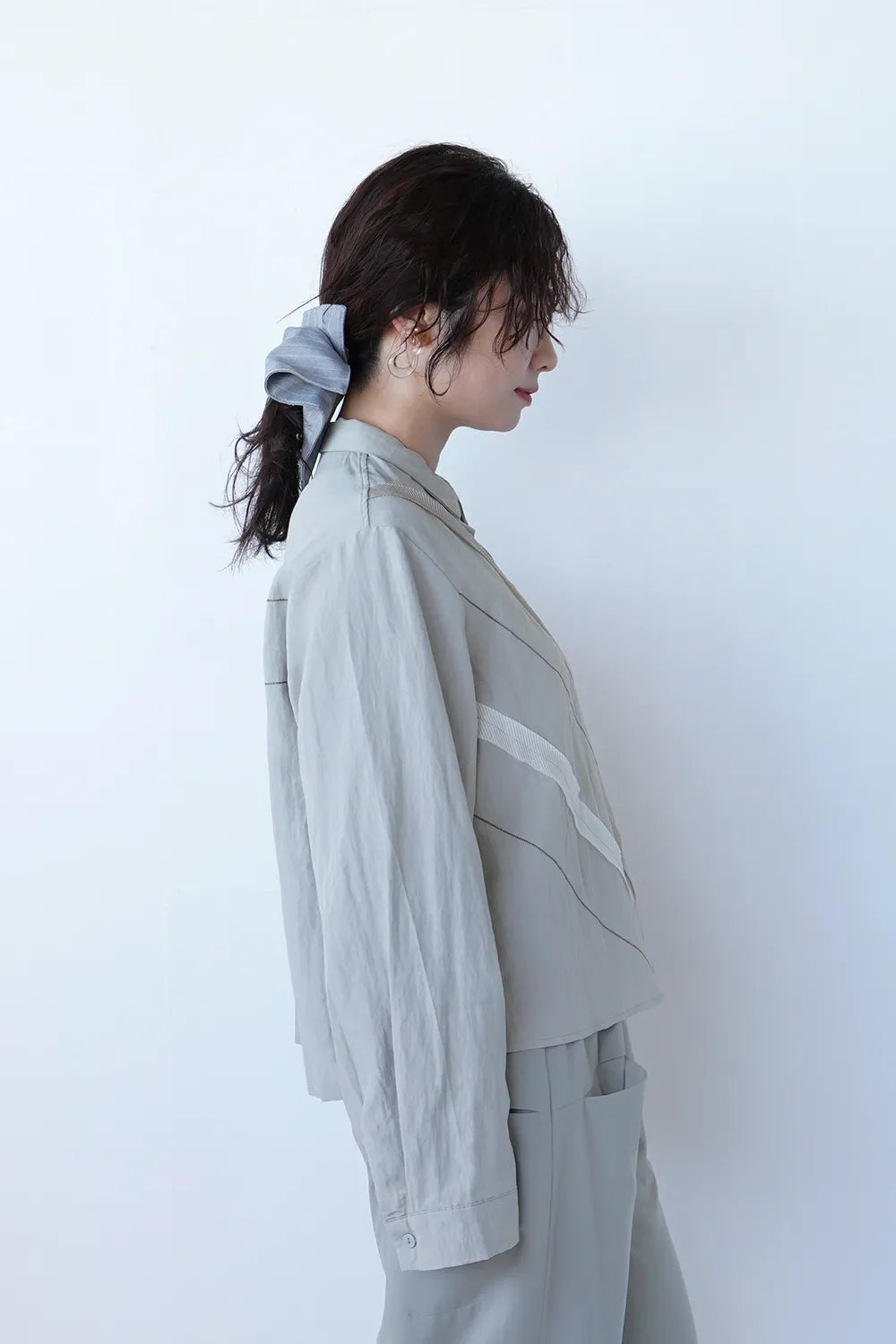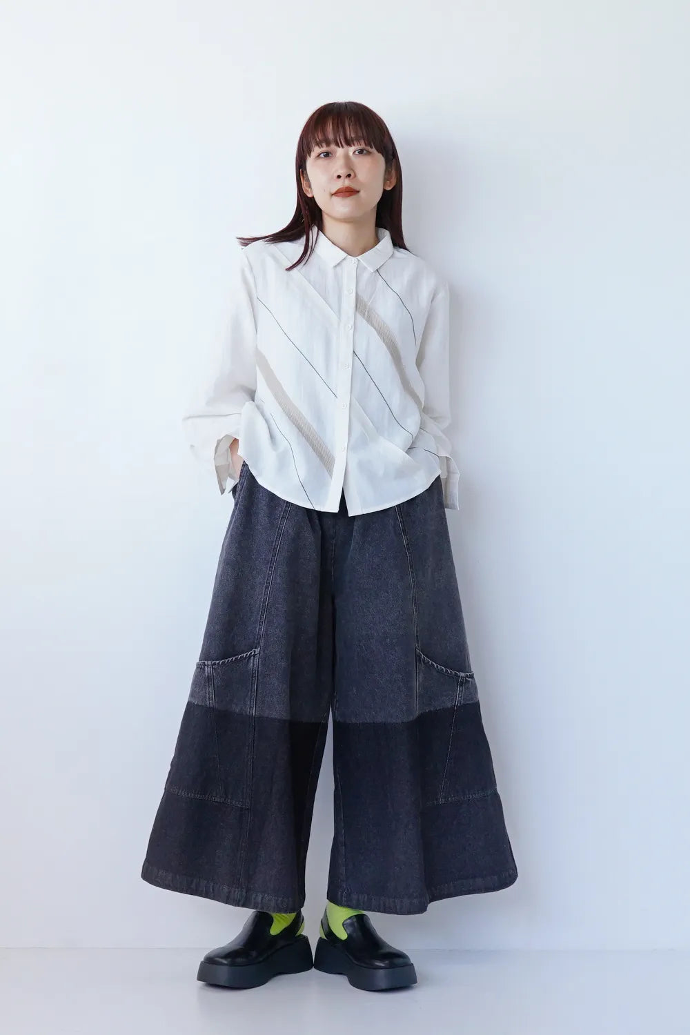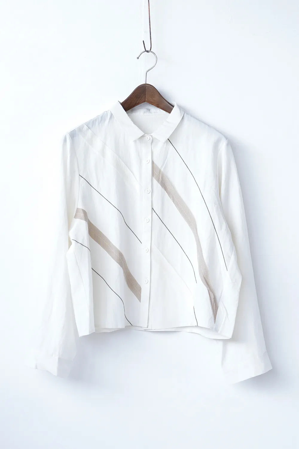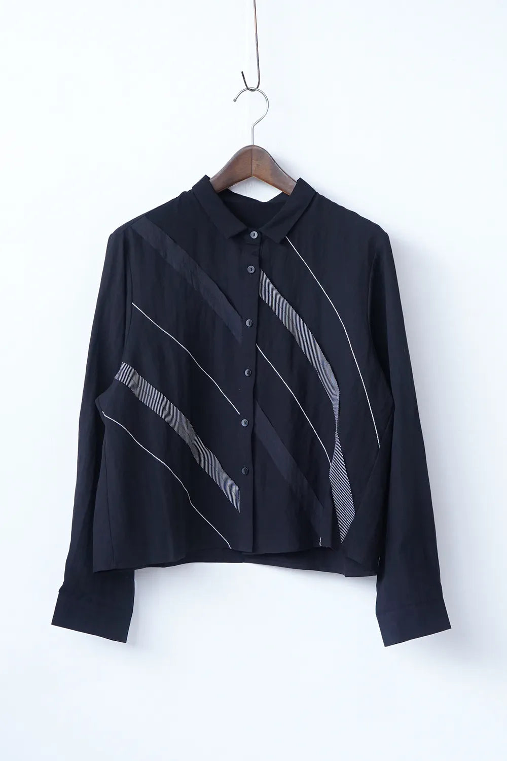 大胆に斜めにデザインされたラインが個性的なシャツ。レーヨン混の滑らかな素材感で春夏向けのさらっとした生地感。身幅は体のラインを拾わないゆったりサイズで、着丈はやや短めのシルエット。ロングシーズン活躍できそうな1枚です。