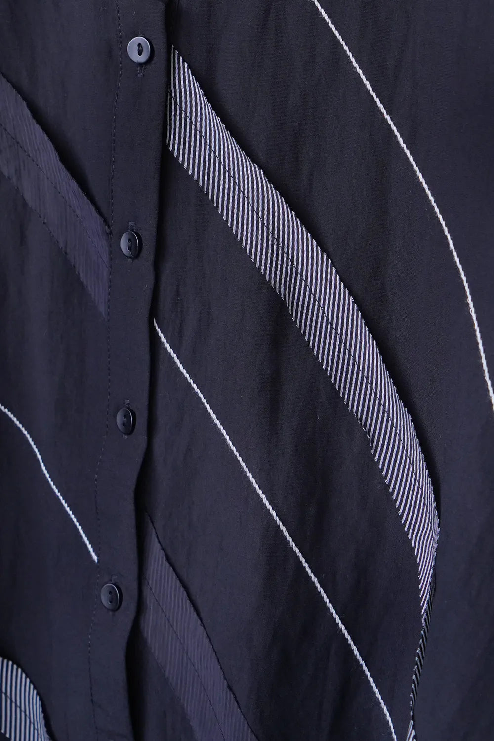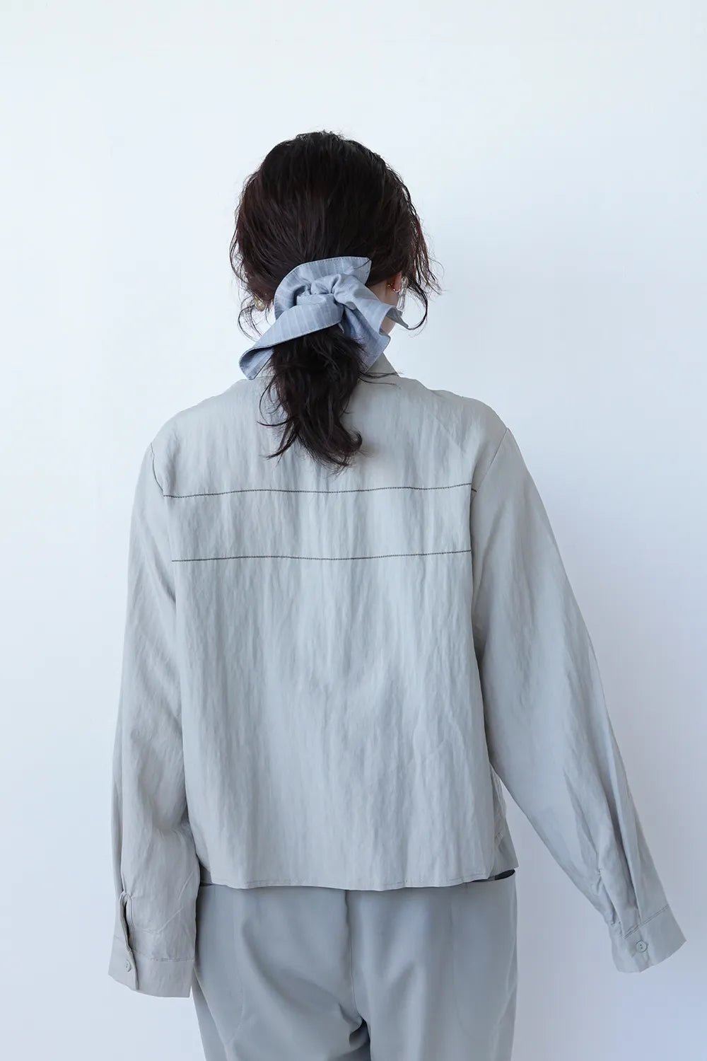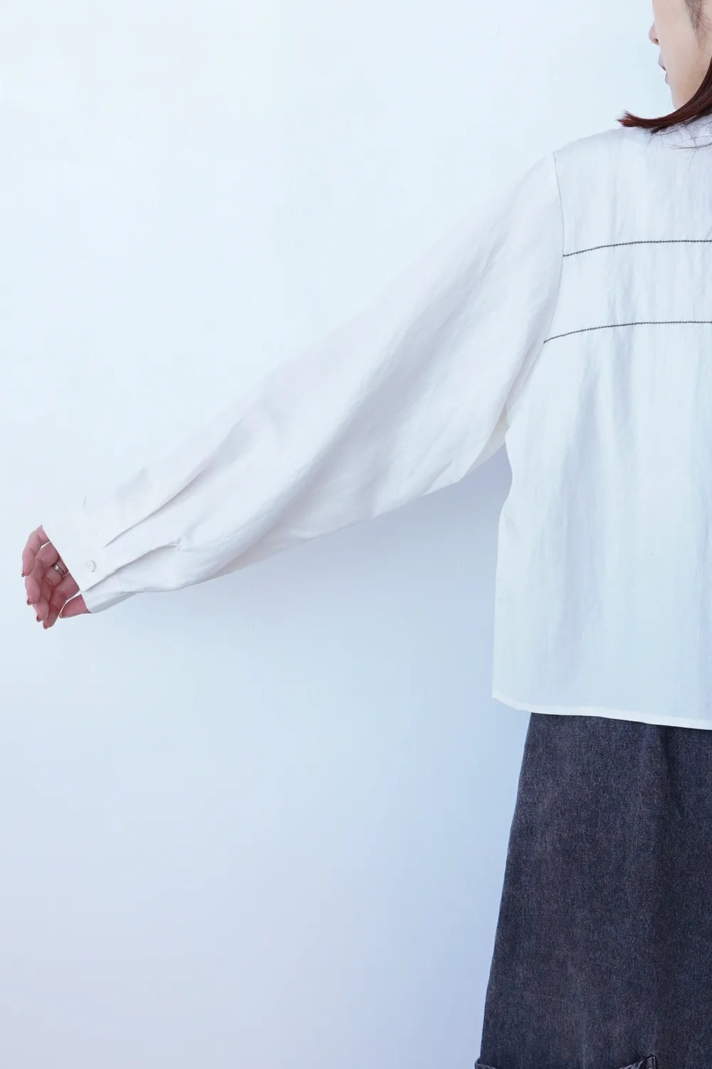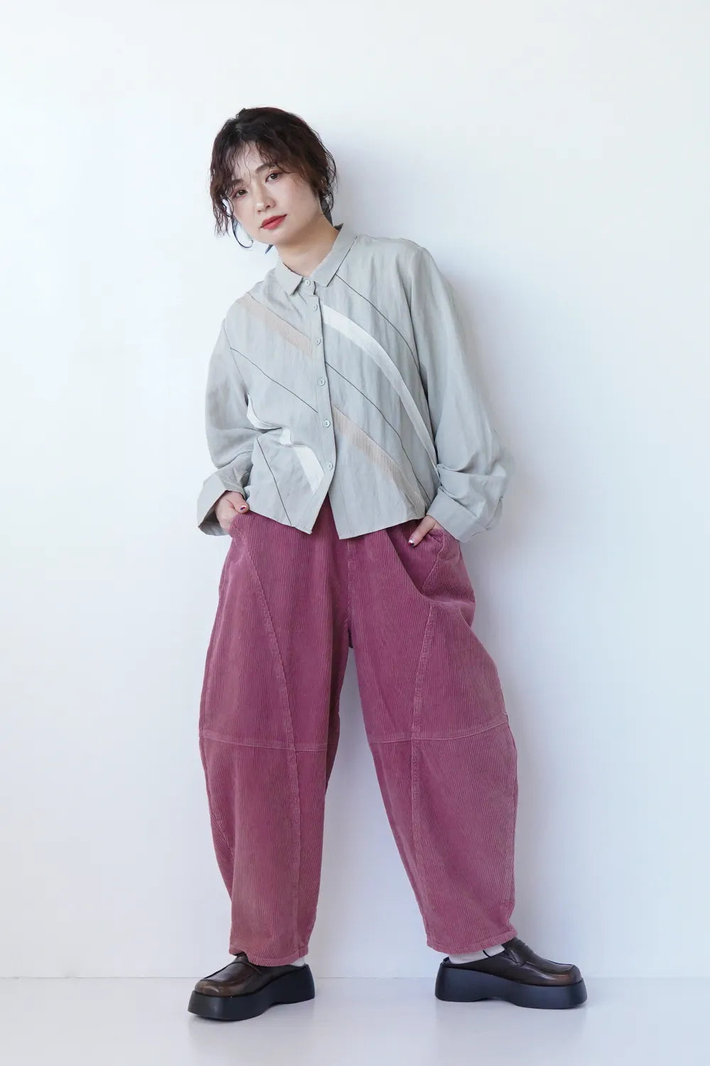 大胆に斜めにデザインされたラインが個性的なシャツ。レーヨン混の滑らかな素材感で春夏向けのさらっとした生地感。身幅は体のラインを拾わないゆったりサイズで、着丈はやや短めのシルエット。ロングシーズン活躍できそうな1枚です。