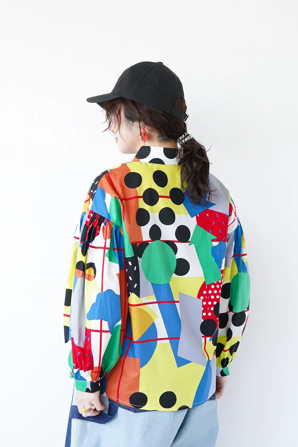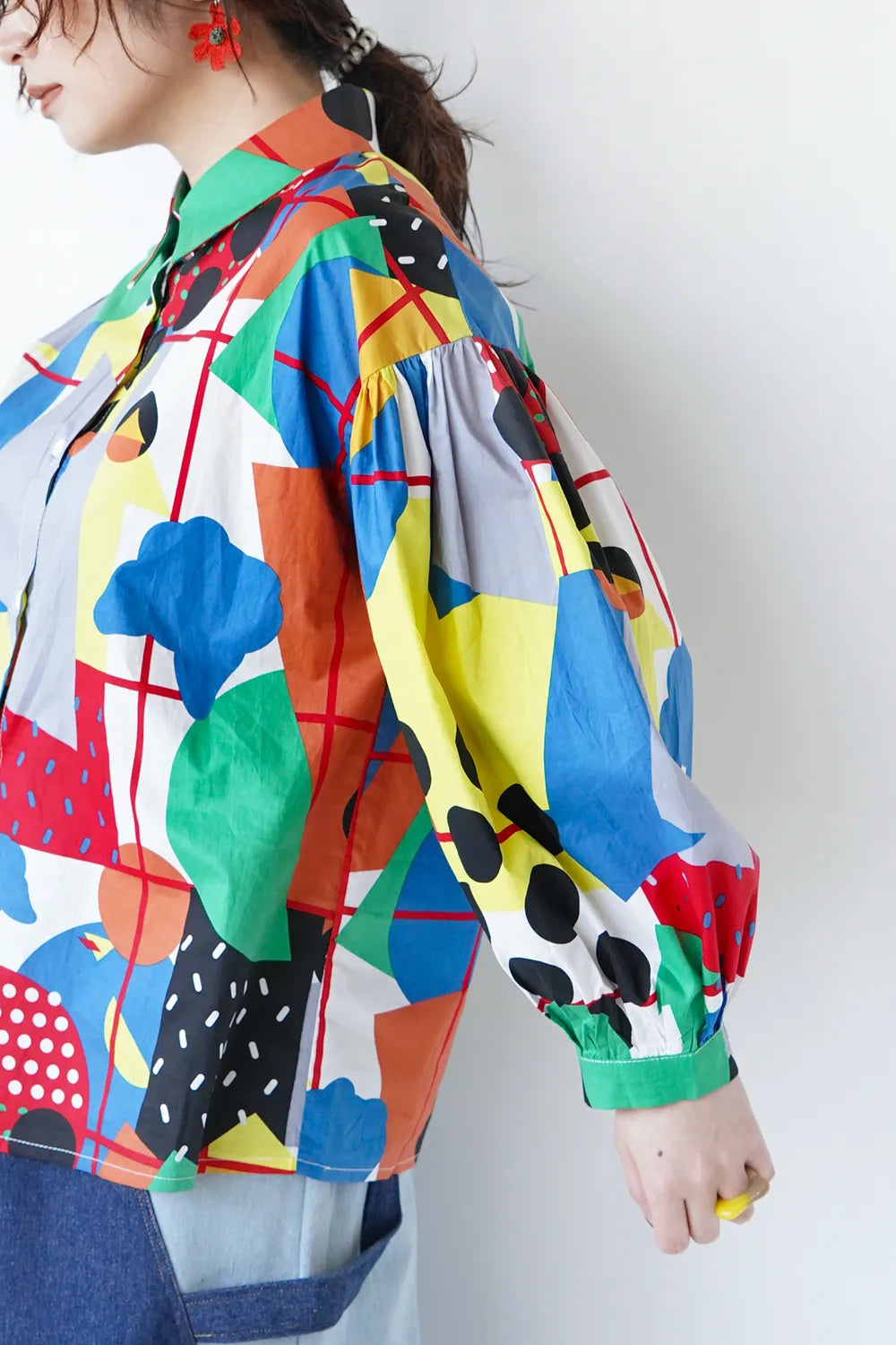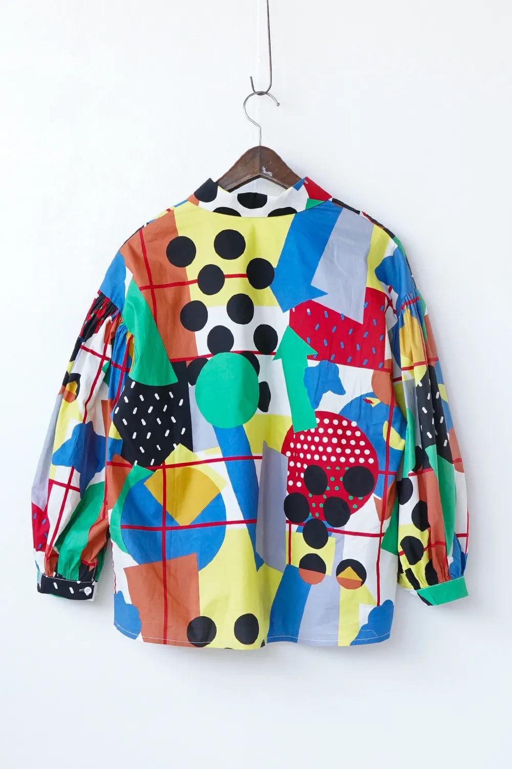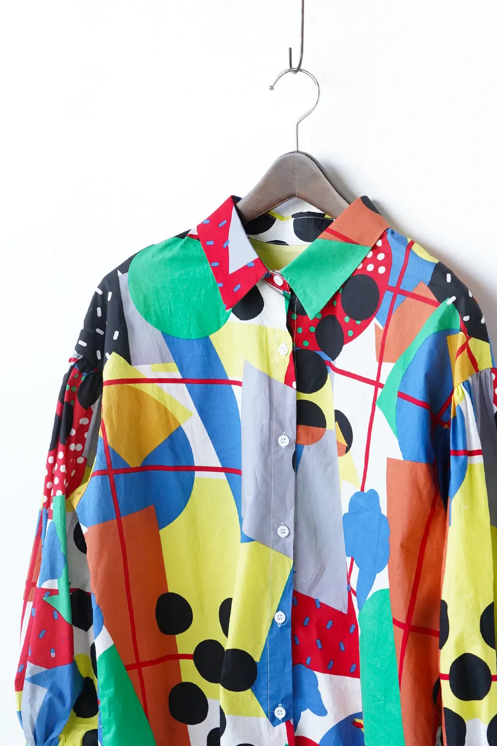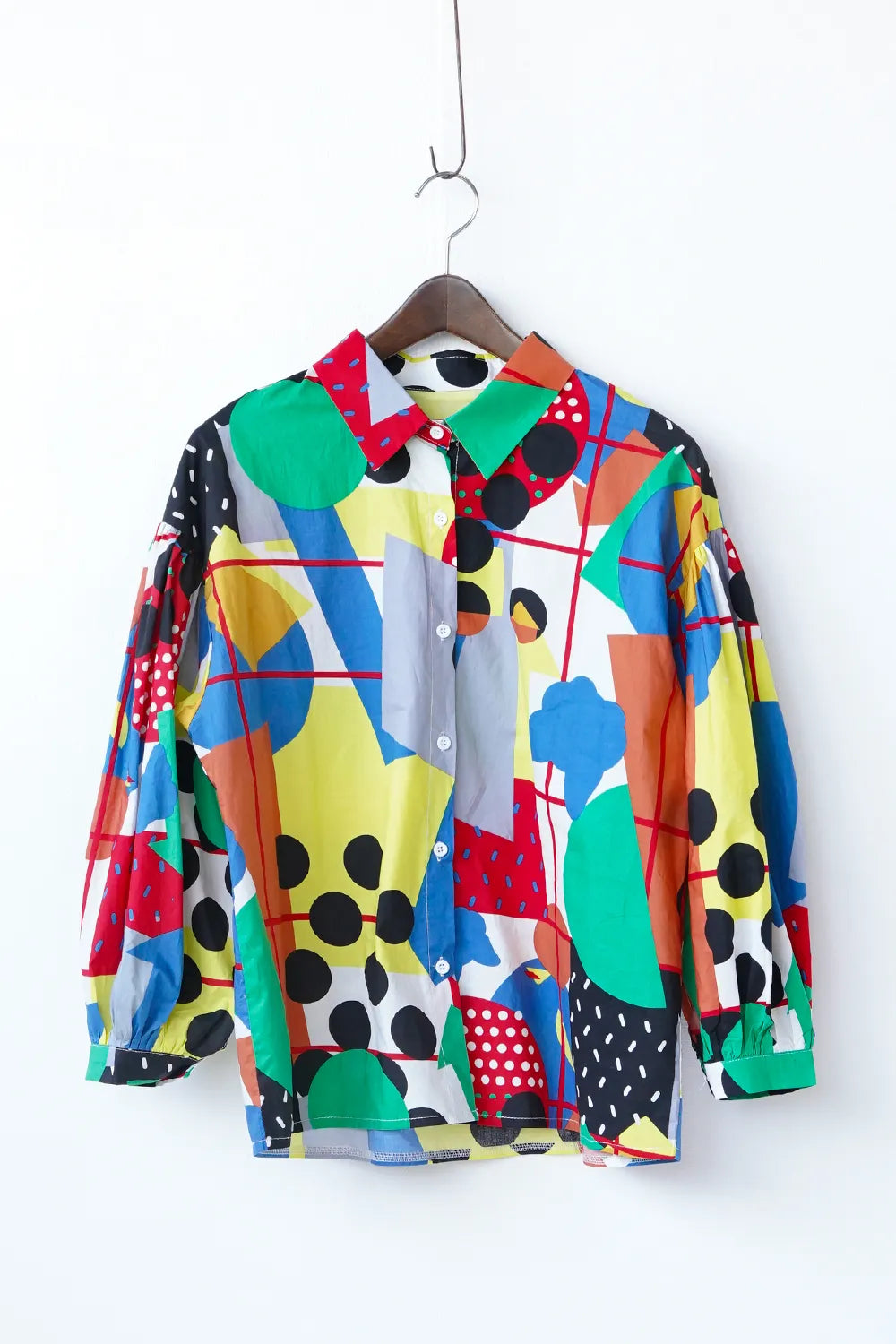インパクトある大胆な幾何学プリントが個性的なシャツ。ポップなイラストタッチにふんだんにカラーを散りばめた遊び心のある1枚。綿100%のハリ感のある素材で身幅はたっぷりと着やすいシルエット。お袖はドロップパフのやや丸みのあるラインに。柄物好きさんにおすすめ◎