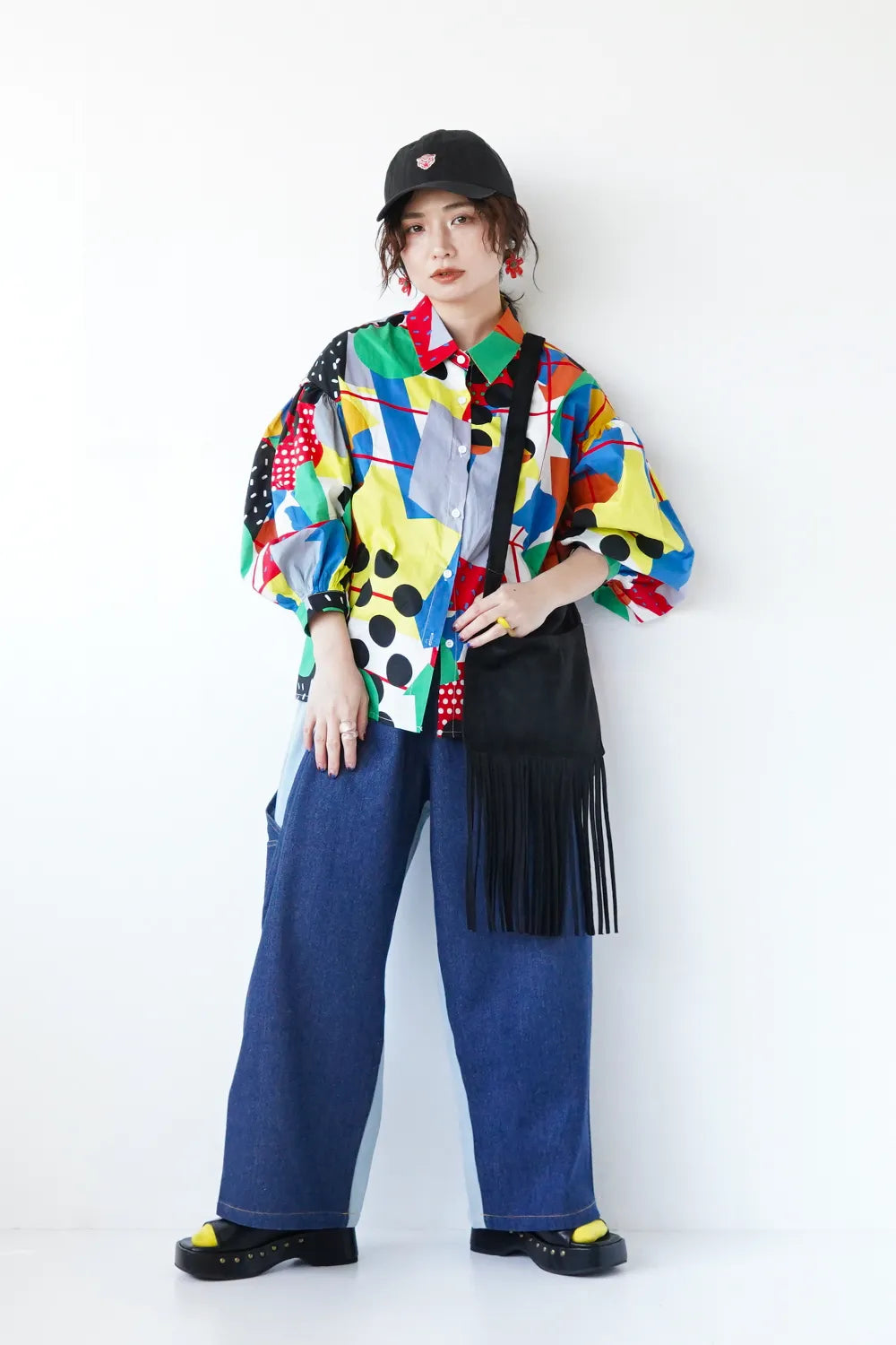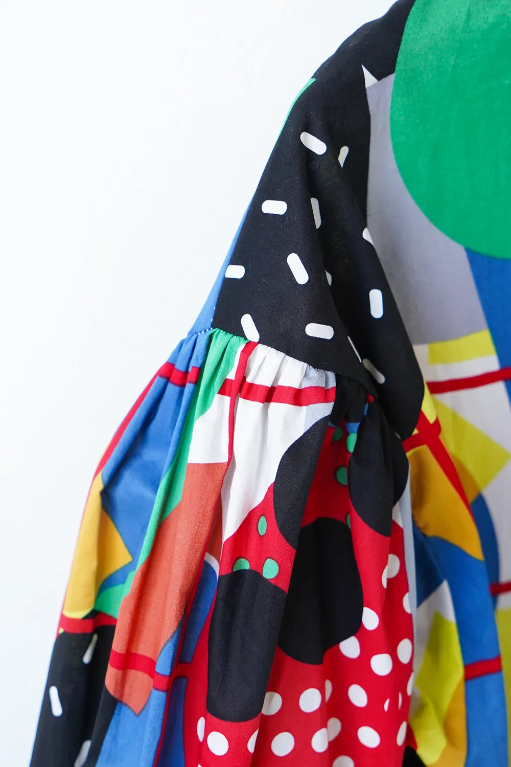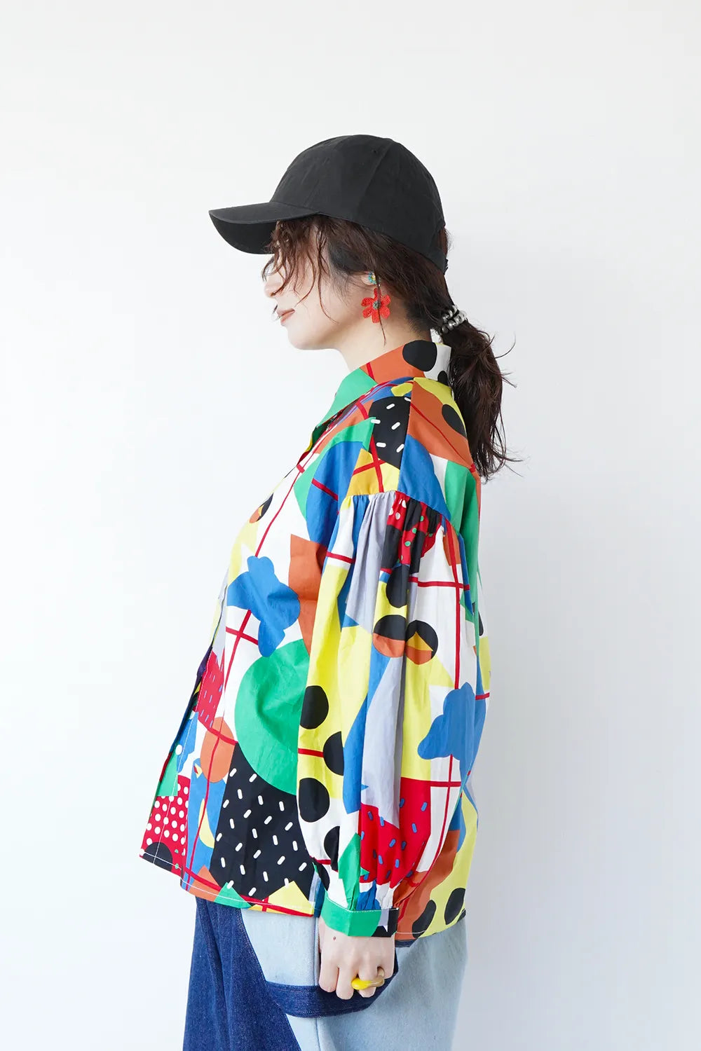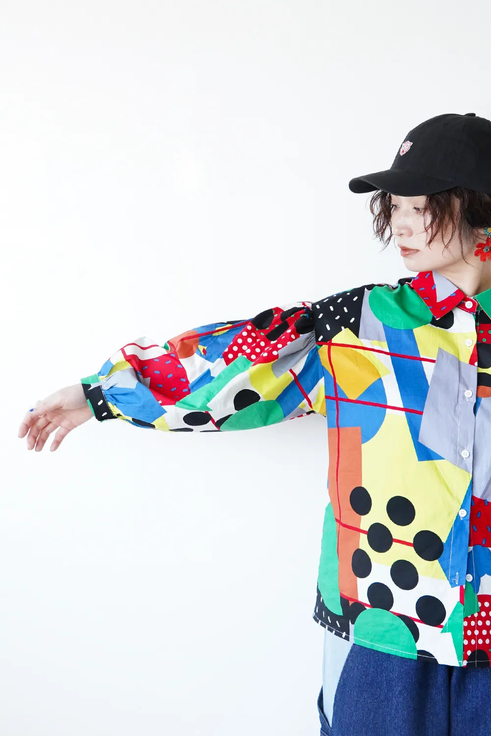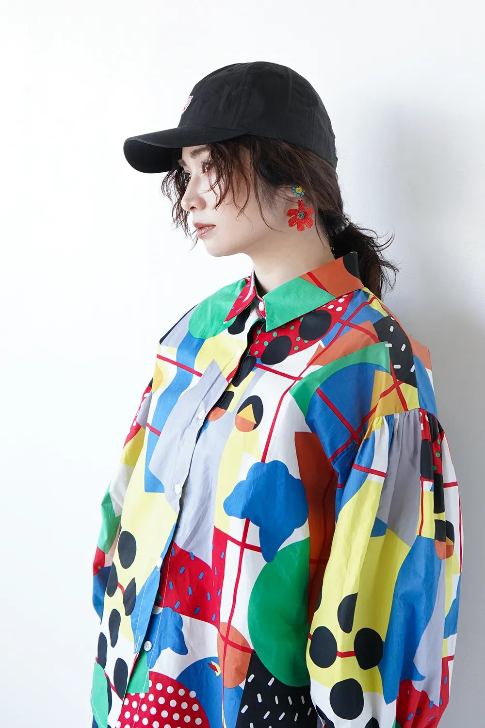 インパクトある大胆な幾何学プリントが個性的なシャツ。ポップなイラストタッチにふんだんにカラーを散りばめた遊び心のある1枚。綿100%のハリ感のある素材で身幅はたっぷりと着やすいシルエット。お袖はドロップパフのやや丸みのあるラインに。柄物好きさんにおすすめ◎
