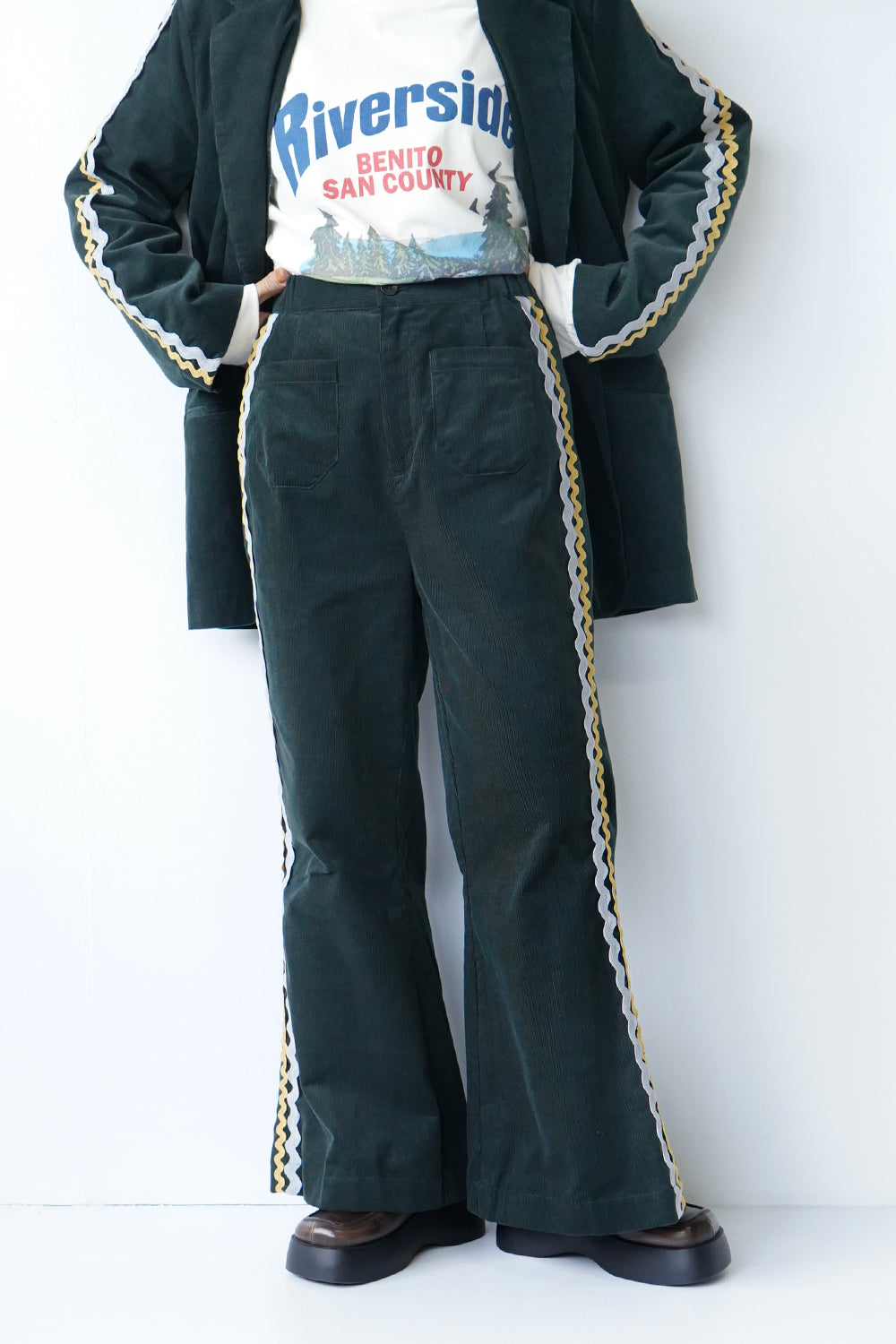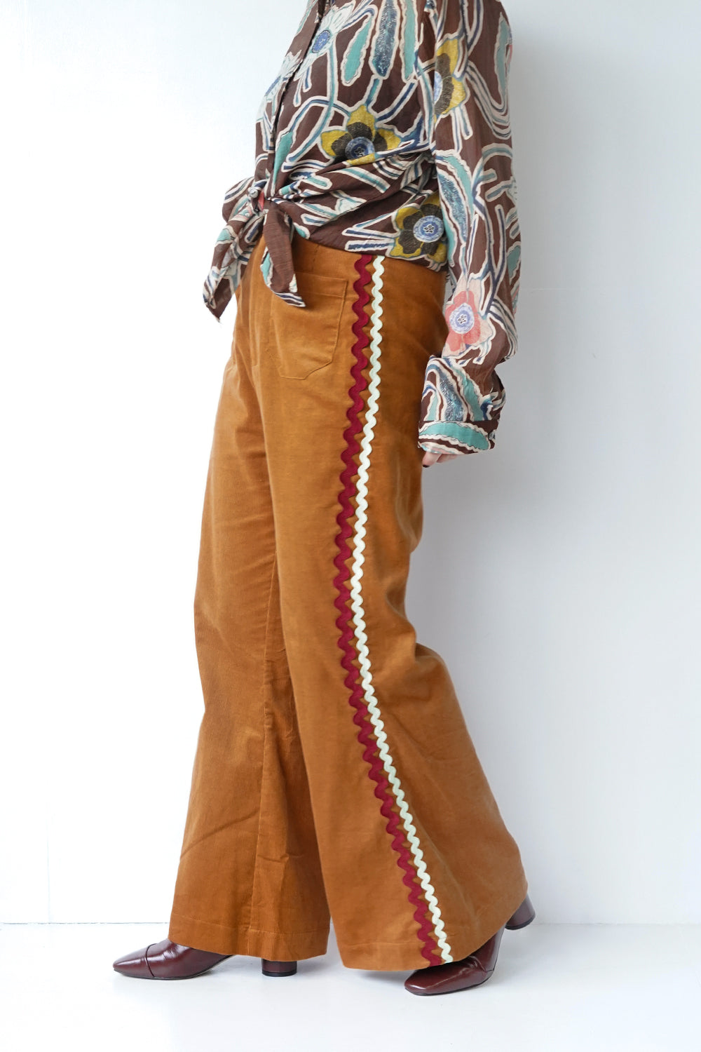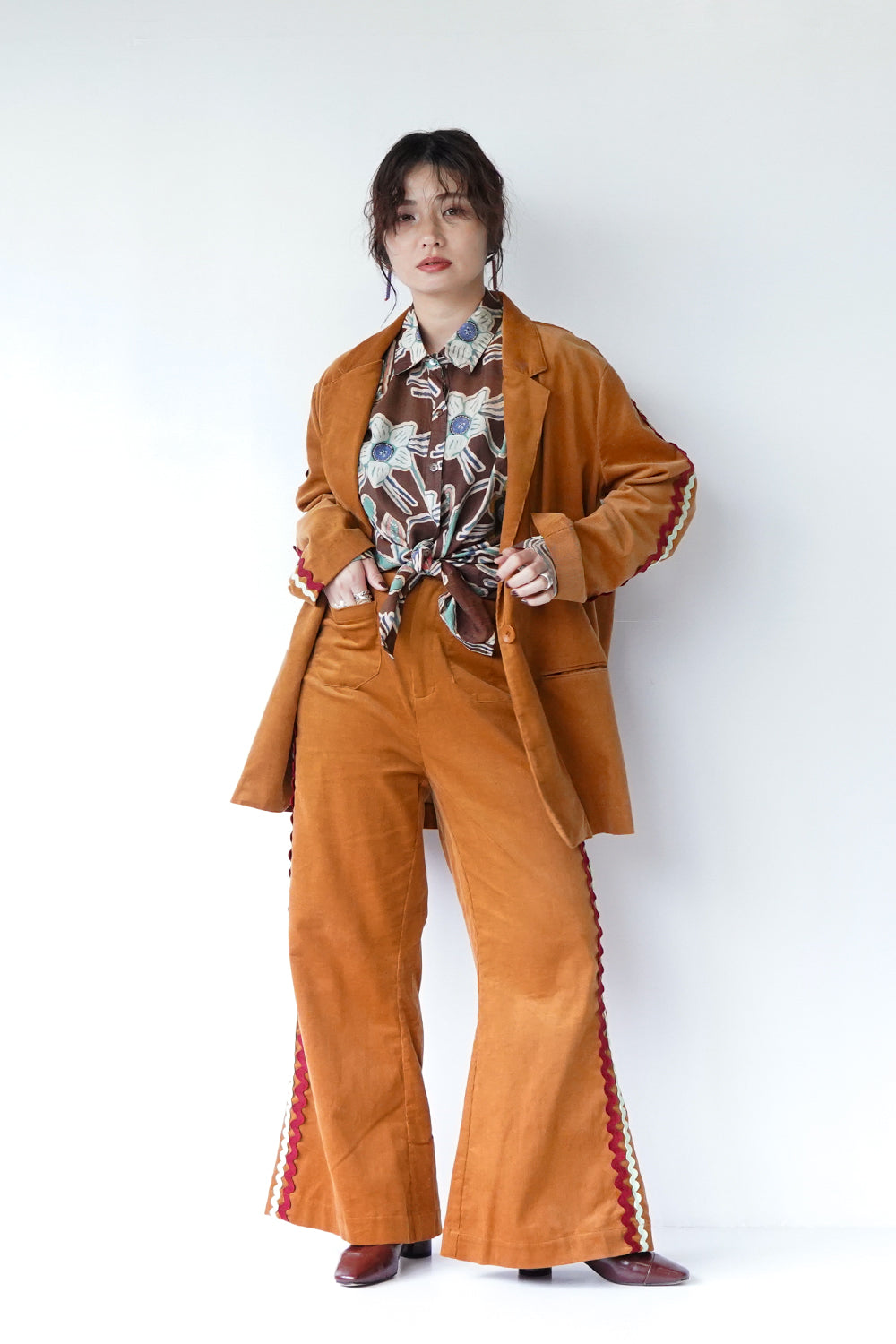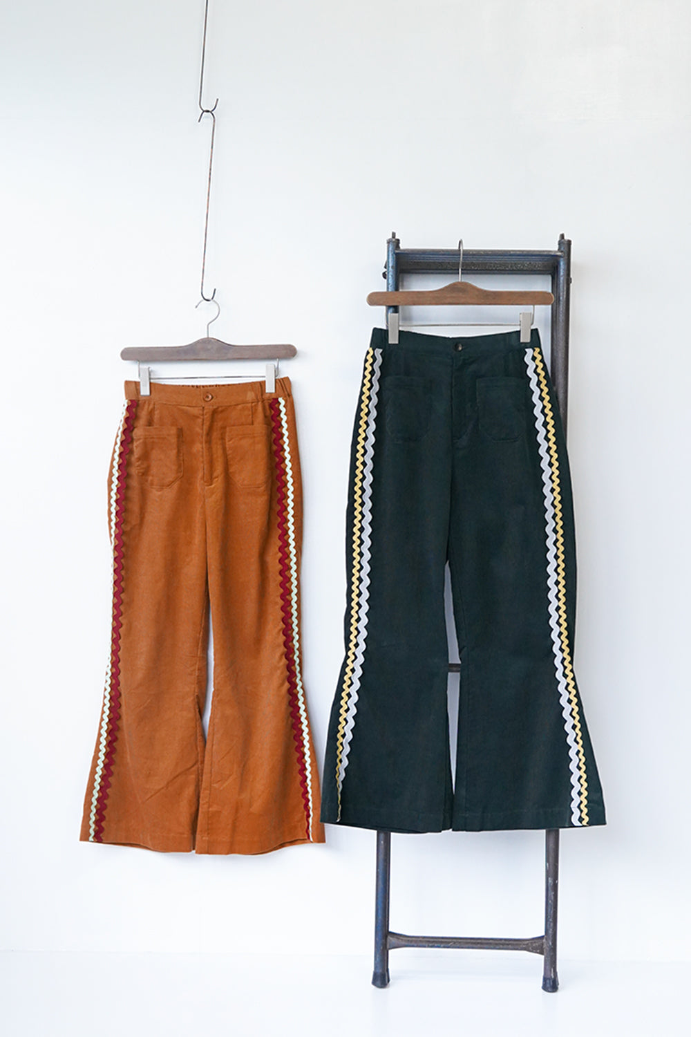 リックラックテープデザインがインパクトのある【LILA n’ citta】オリジナルのコーデュロイパンツ。ポップな配色のなみなみラインが特徴的な1枚。腰回りはすっきりめにし膝から裾にかけてフレアラインが出るようなシルエットにしバランスよく仕立てた1枚。秋らしいこっくりとしたカラー展開にしてセットアップでスタイリングできるように同生地でジャケットも作りました。フロントのポケットもアクセントに◎