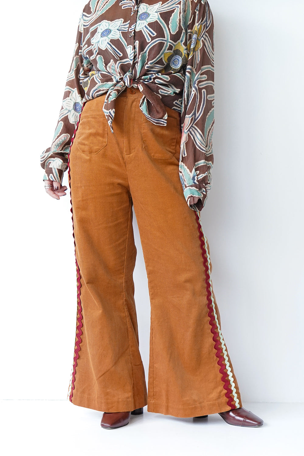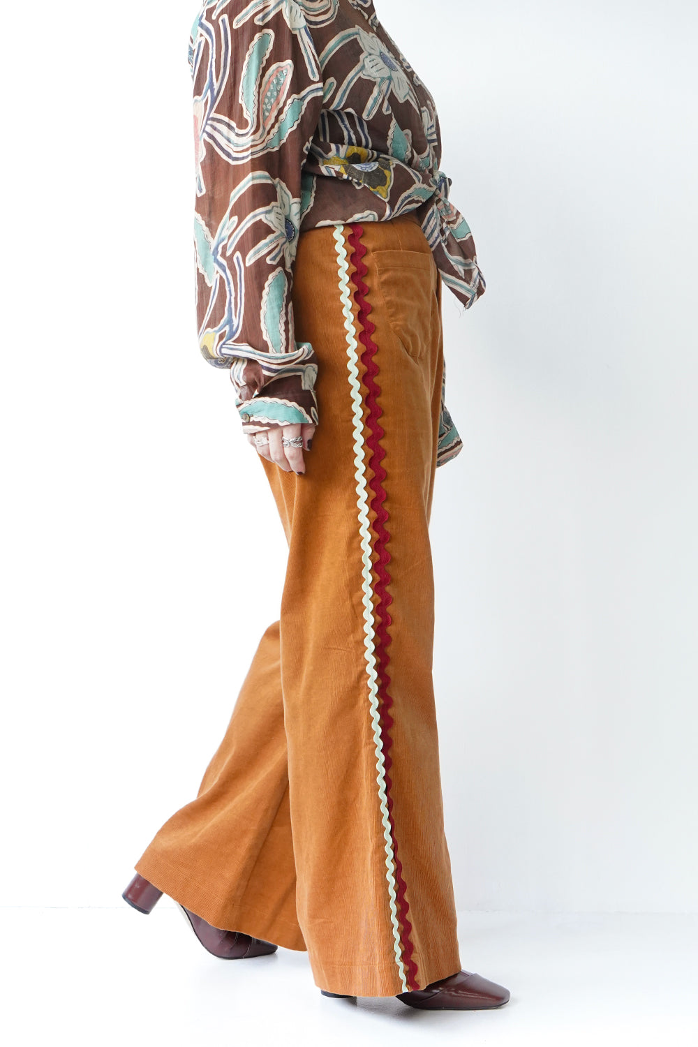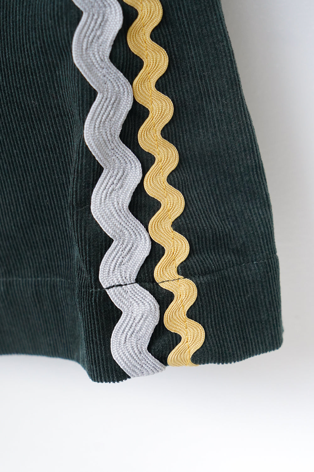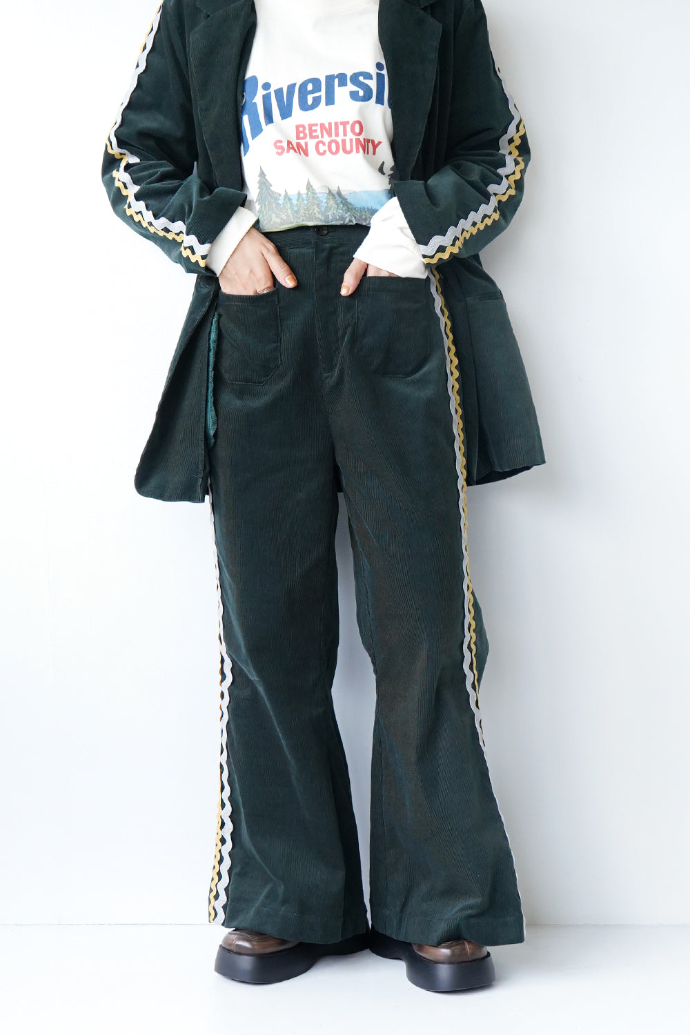 リックラックテープデザインがインパクトのある【LILA n’ citta】オリジナルのコーデュロイパンツ。ポップな配色のなみなみラインが特徴的な1枚。腰回りはすっきりめにし膝から裾にかけてフレアラインが出るようなシルエットにしバランスよく仕立てた1枚。秋らしいこっくりとしたカラー展開にしてセットアップでスタイリングできるように同生地でジャケットも作りました。フロントのポケットもアクセントに◎
