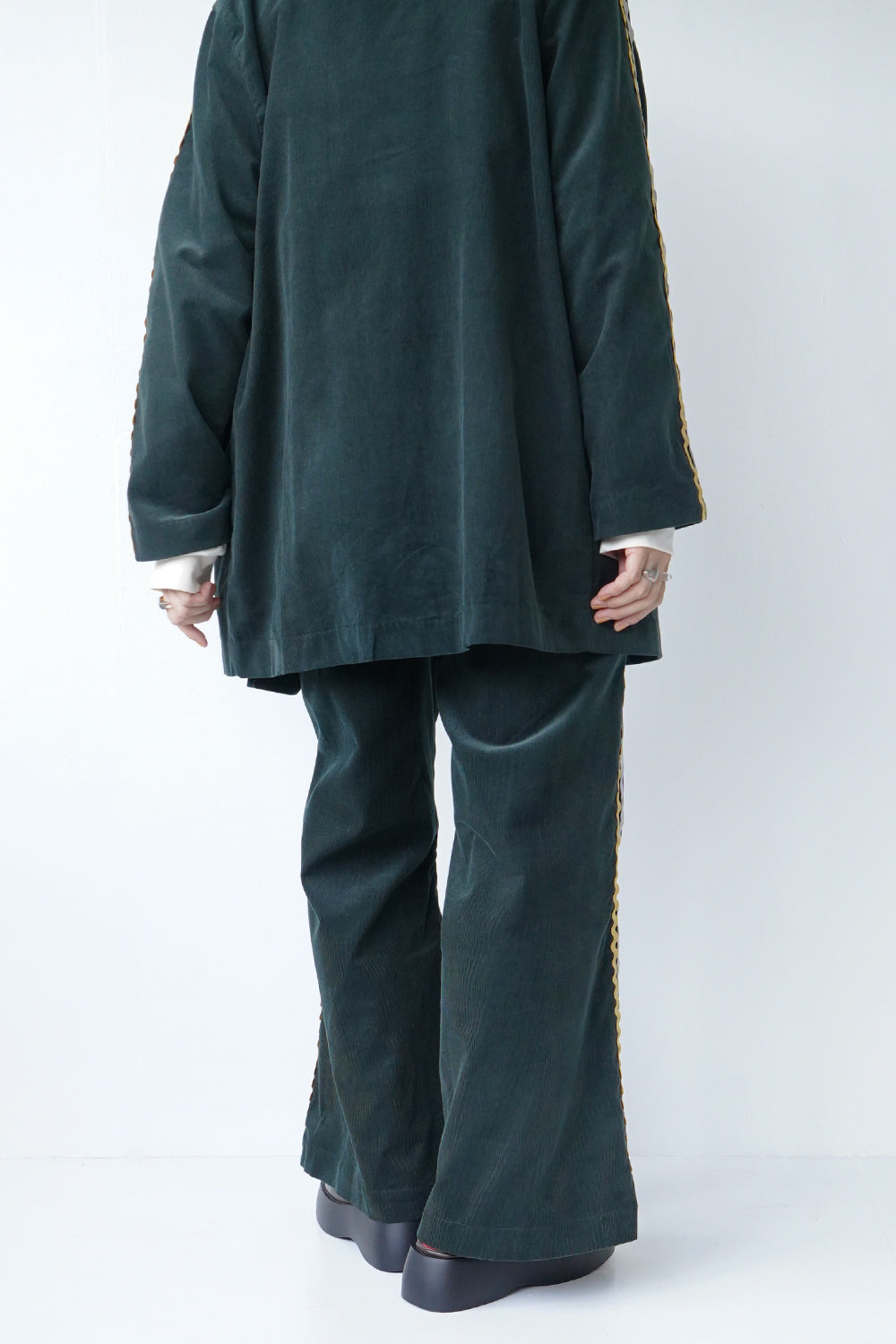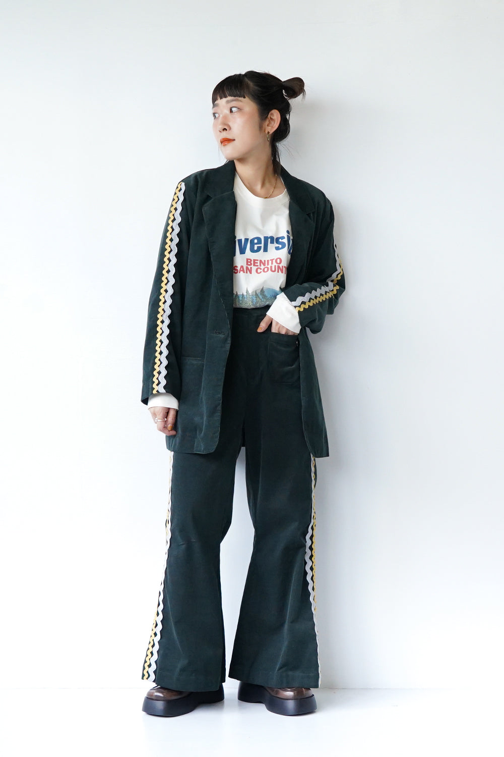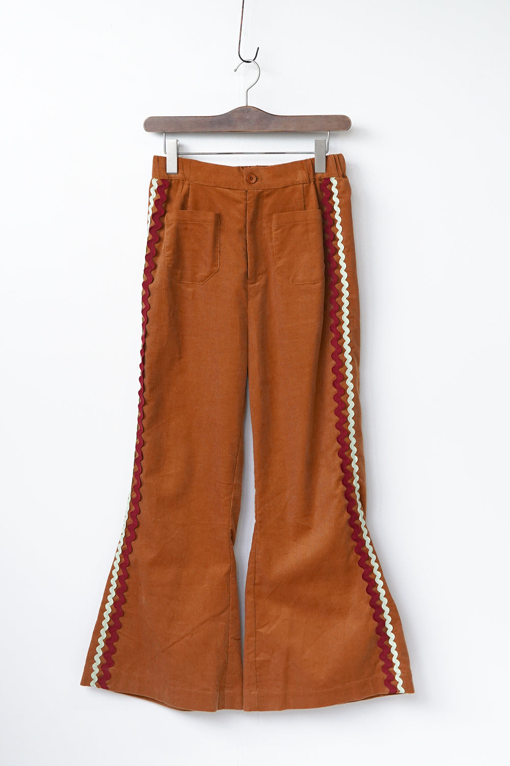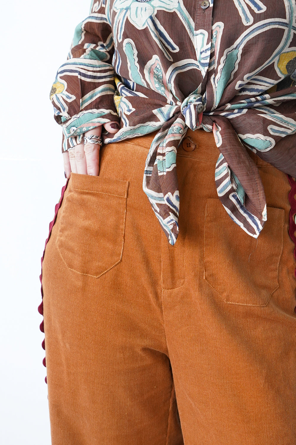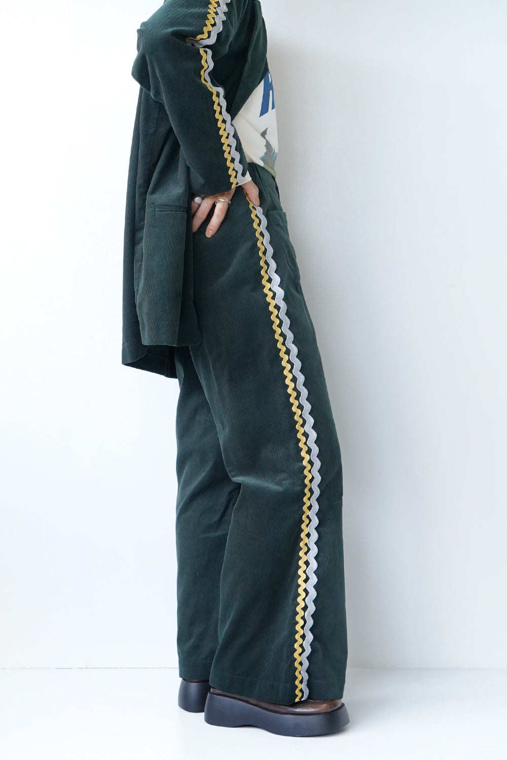 リックラックテープデザインがインパクトのある【LILA n’ citta】オリジナルのコーデュロイパンツ。ポップな配色のなみなみラインが特徴的な1枚。腰回りはすっきりめにし膝から裾にかけてフレアラインが出るようなシルエットにしバランスよく仕立てた1枚。秋らしいこっくりとしたカラー展開にしてセットアップでスタイリングできるように同生地でジャケットも作りました。フロントのポケットもアクセントに◎