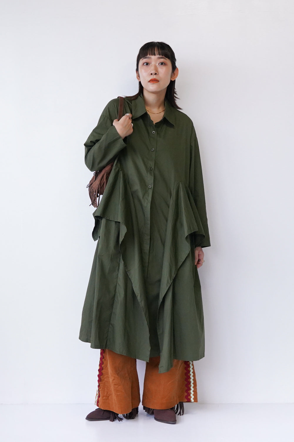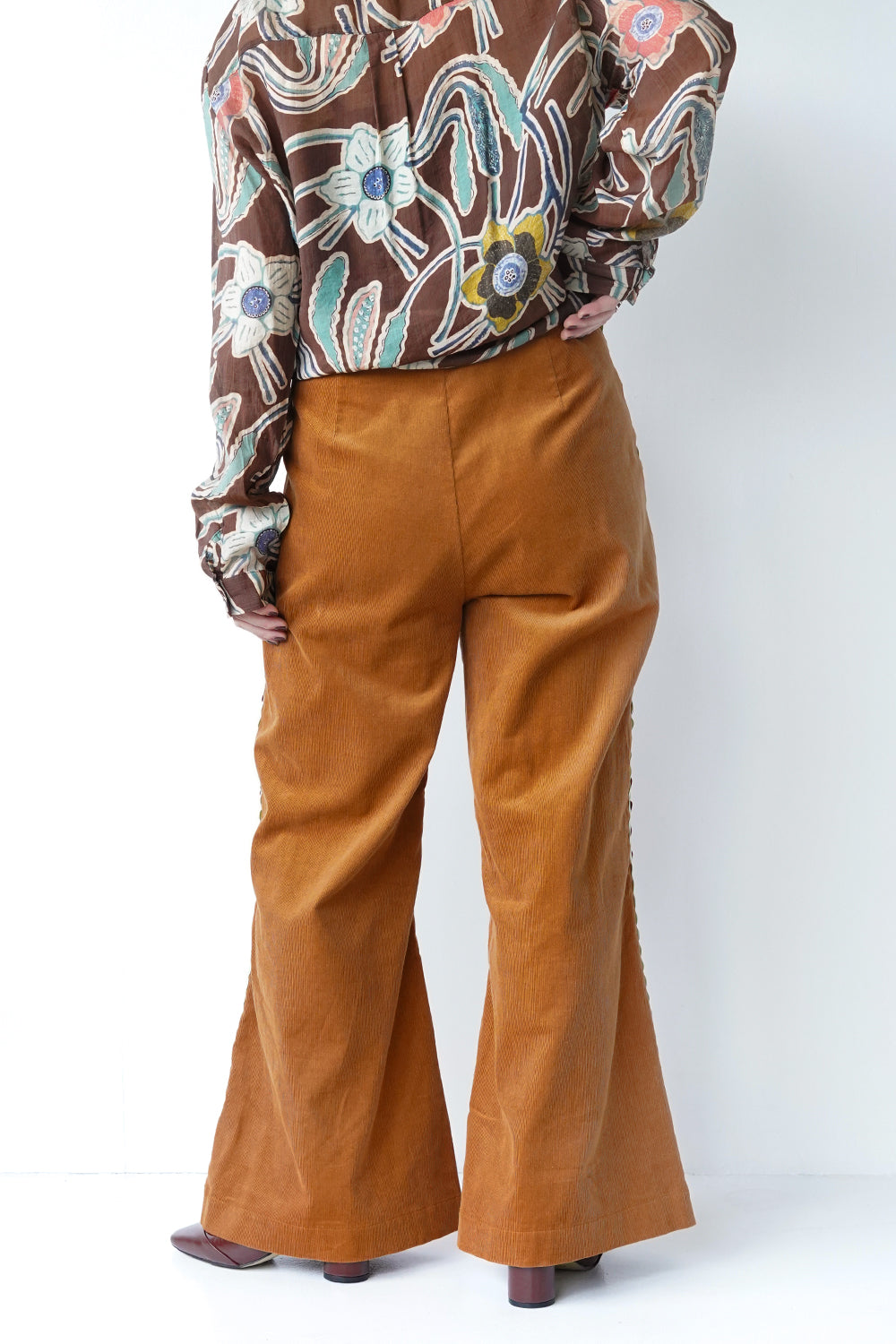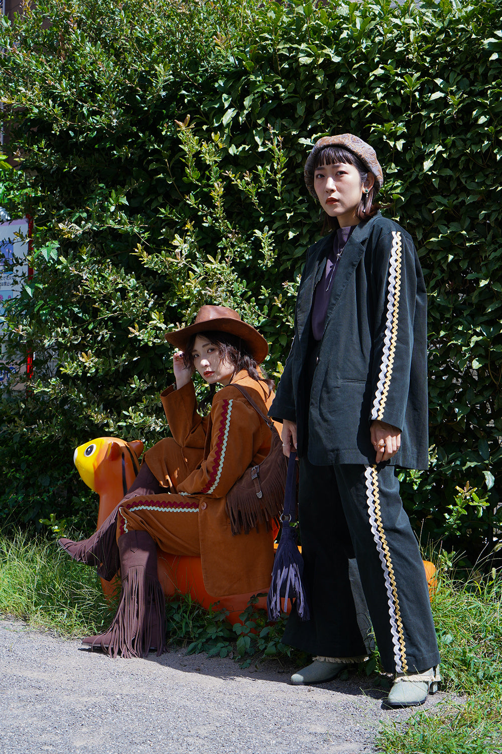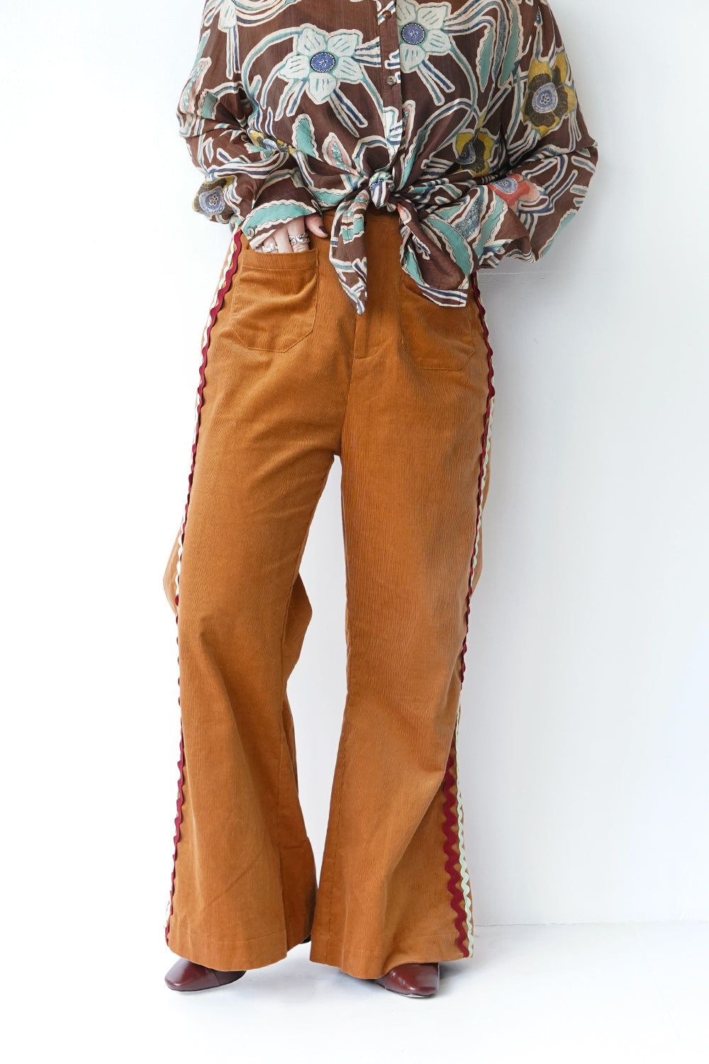 リックラックテープデザインがインパクトのある【LILA n’ citta】オリジナルのコーデュロイパンツ。ポップな配色のなみなみラインが特徴的な1枚。腰回りはすっきりめにし膝から裾にかけてフレアラインが出るようなシルエットにしバランスよく仕立てた1枚。秋らしいこっくりとしたカラー展開にしてセットアップでスタイリングできるように同生地でジャケットも作りました。フロントのポケットもアクセントに◎